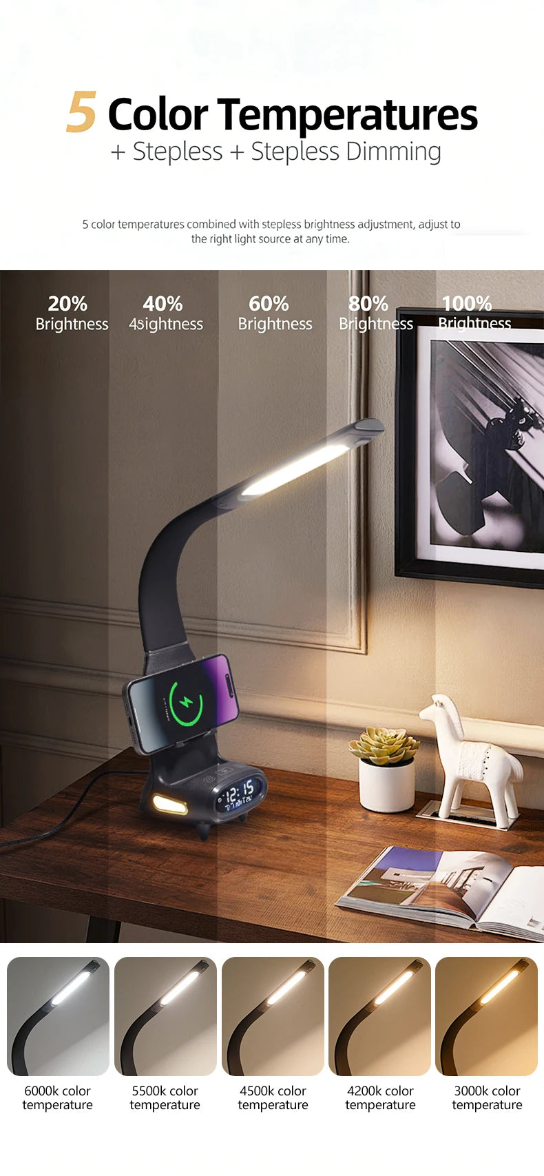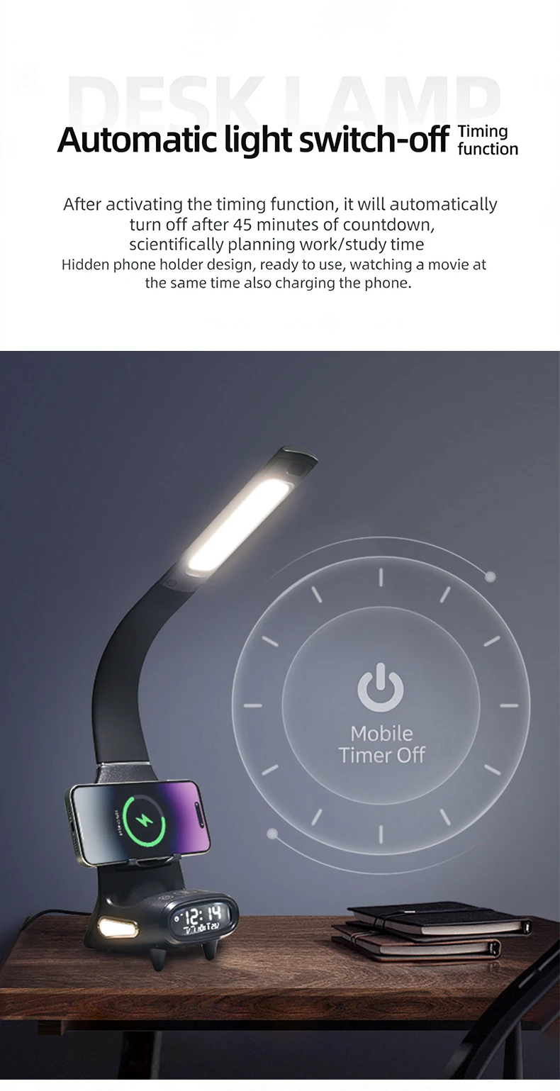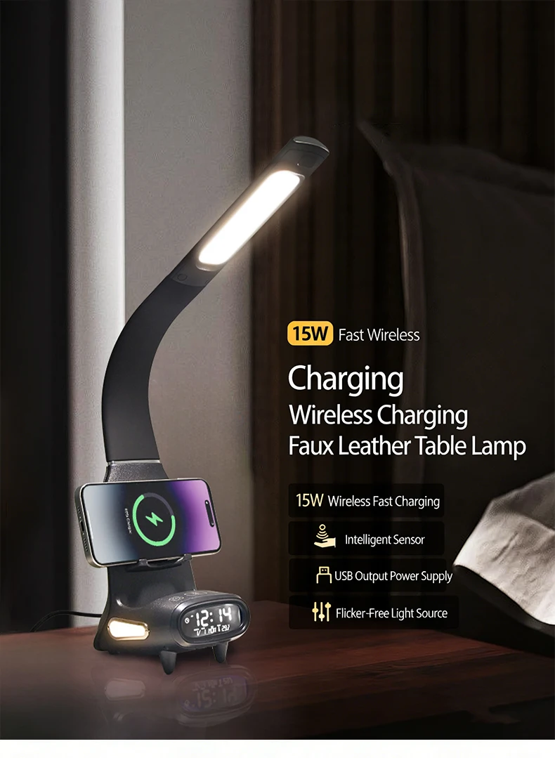 Multi-Function Eye-Protecting Reading Desk Lamp for Students 3000K-6000K Stepless Dimming 15W Wireless Fast Charging Study Light
