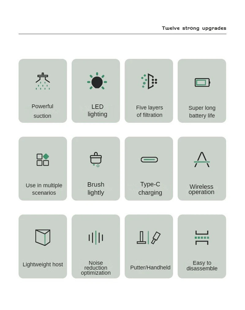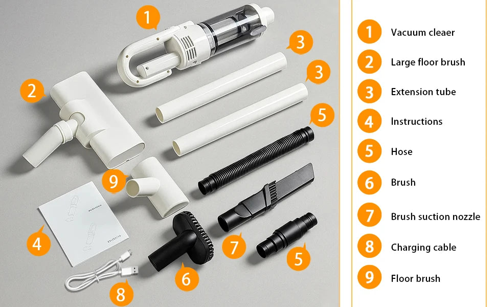 1. This wireless vacuum cleaner has a super suction power of 6500Pa, adopts quadruple high-efficiency filtration, and multiple sets of brush heads for cleaning. It is very easy for you to clean your home or the car.