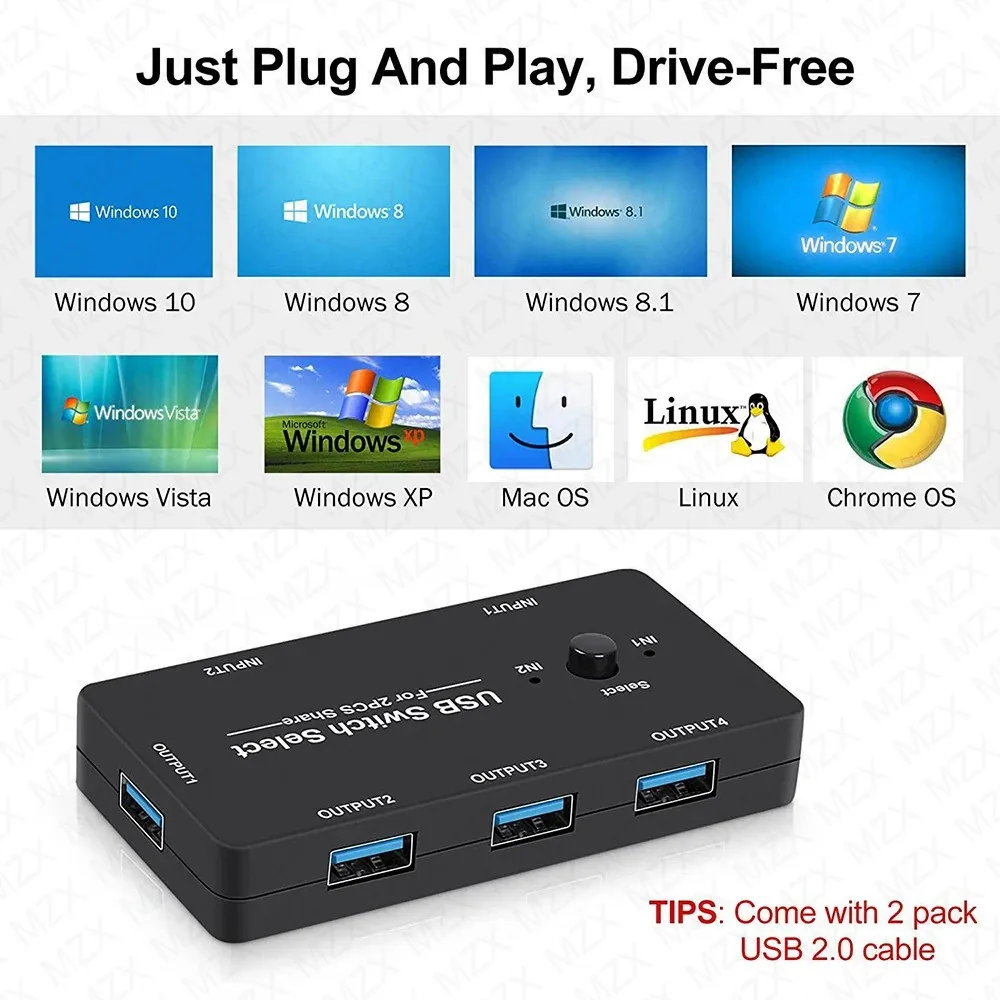 Supports 2 USB inputs and 4 USB HUB outputs. 4 port USB switch works flawlessly with Windows 11/10/8/8.1/7/Vista/XP, Mac OS X, Linux, and Chrome OS. Driver-free, simply plug and play.