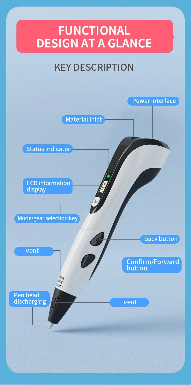 2: In order to extend the lifespan of your 3D printing pen, please press the exit button to exit the PLA filament from 3D after use to avoid blocking the pen hole and affecting the next use.