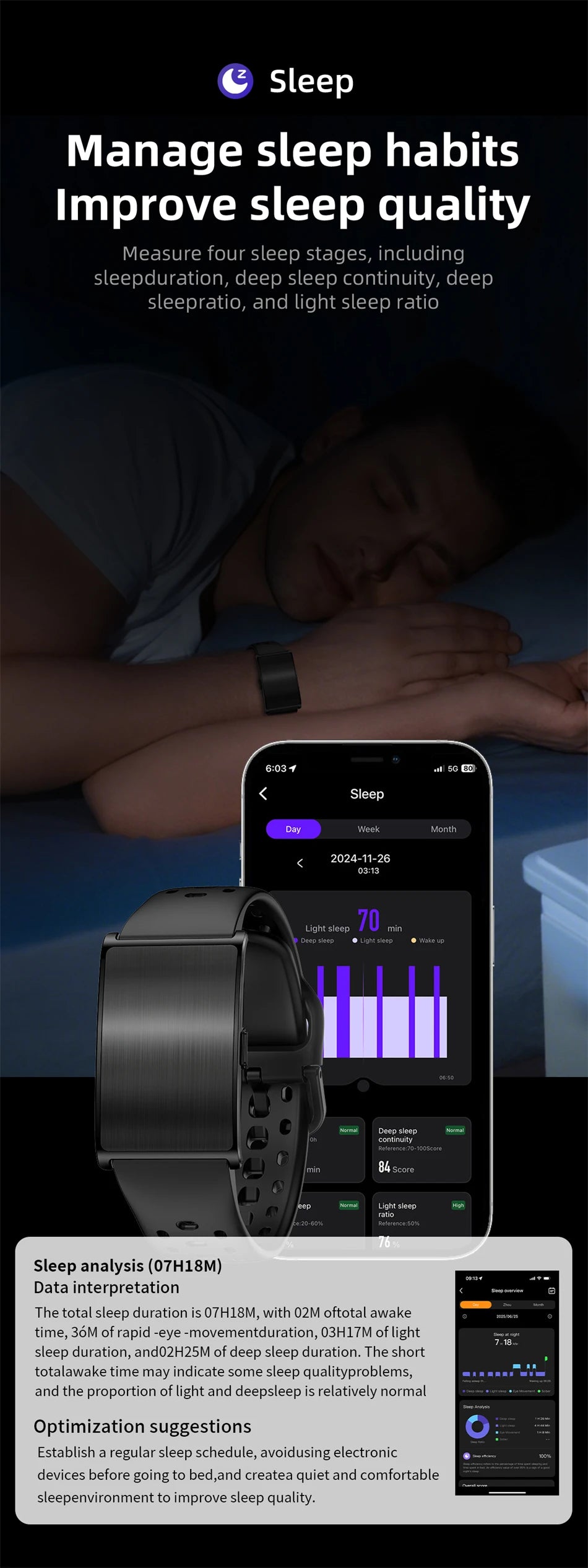 4. Manage sleep habits and improve sleep quality: Measures four sleep stages, including sleep duration, deep sleep continuity, deep sleep ratio, and light sleep ratio.