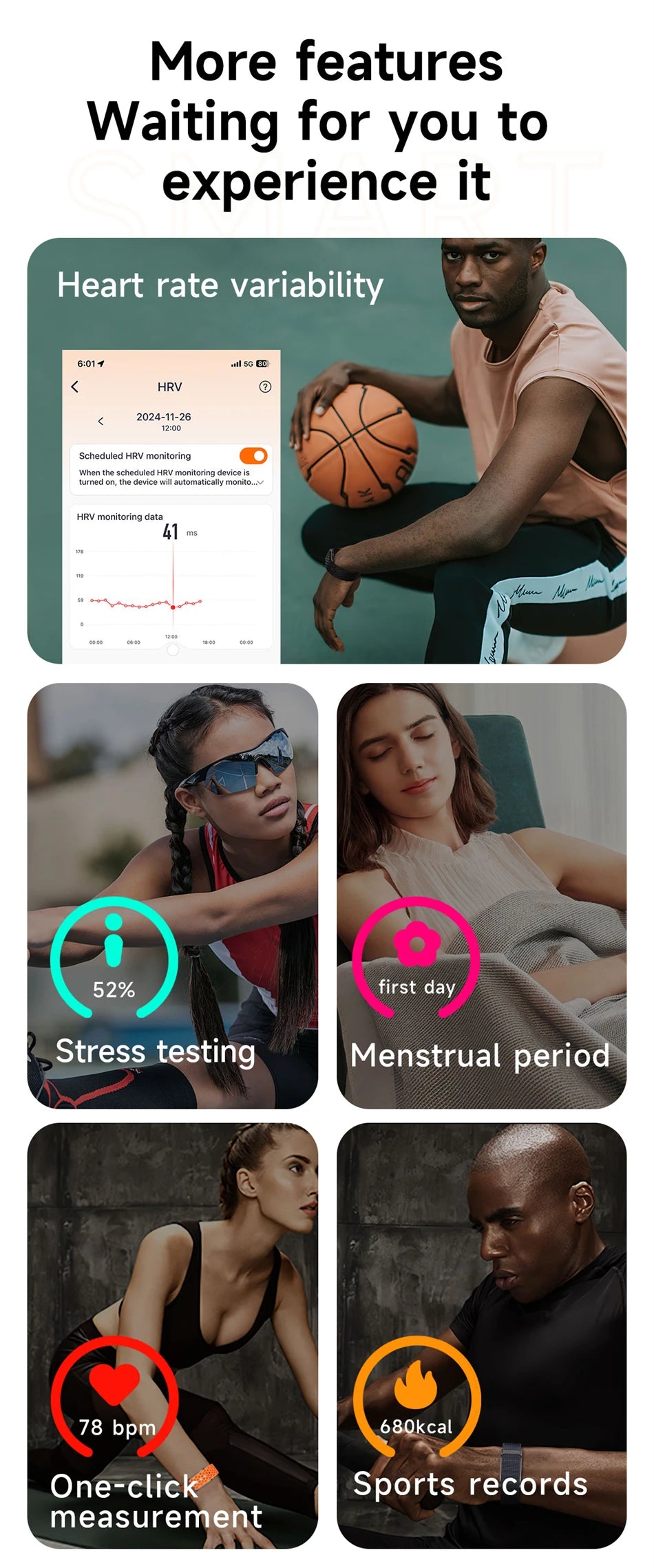 Metrics measured: Heart Rate Monitor,Women's Health Monitoring,Blood Oxygen Monitor,Sleep Monitor,Other,Blood Pressure Monitor,Stress Monitor
