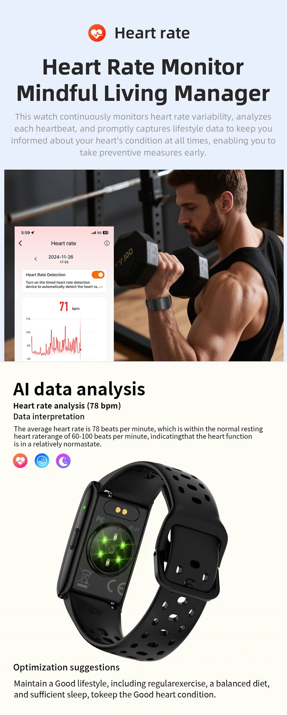 New AI Health Analysis Smart Watch Sport Band Fitness Tracker Heart Rate Blood Pressure HRV Monitor Call Reminder Smart Bracelet