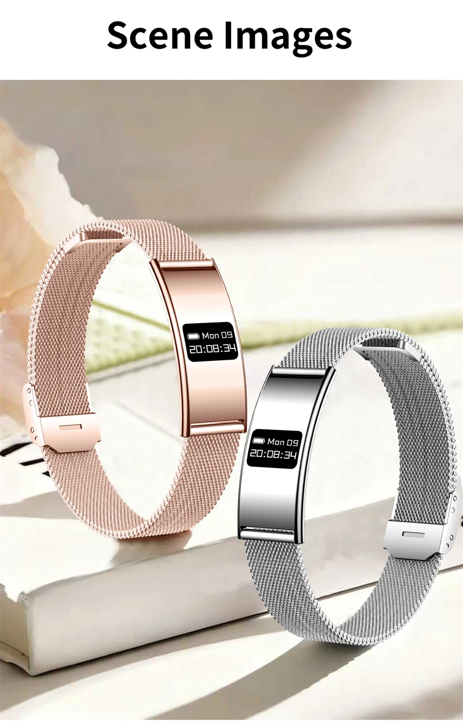 Function: Heart rate monitor, Blood oxygen monitor, Stress test, Heart rate variability monitor, Female physiological cycle, Shake it to take a photo, Multiple sport modes, Sleep tracker (Sleep time ,Sleep quality), Step count/Pedometer, Synchronous data to APK/APP