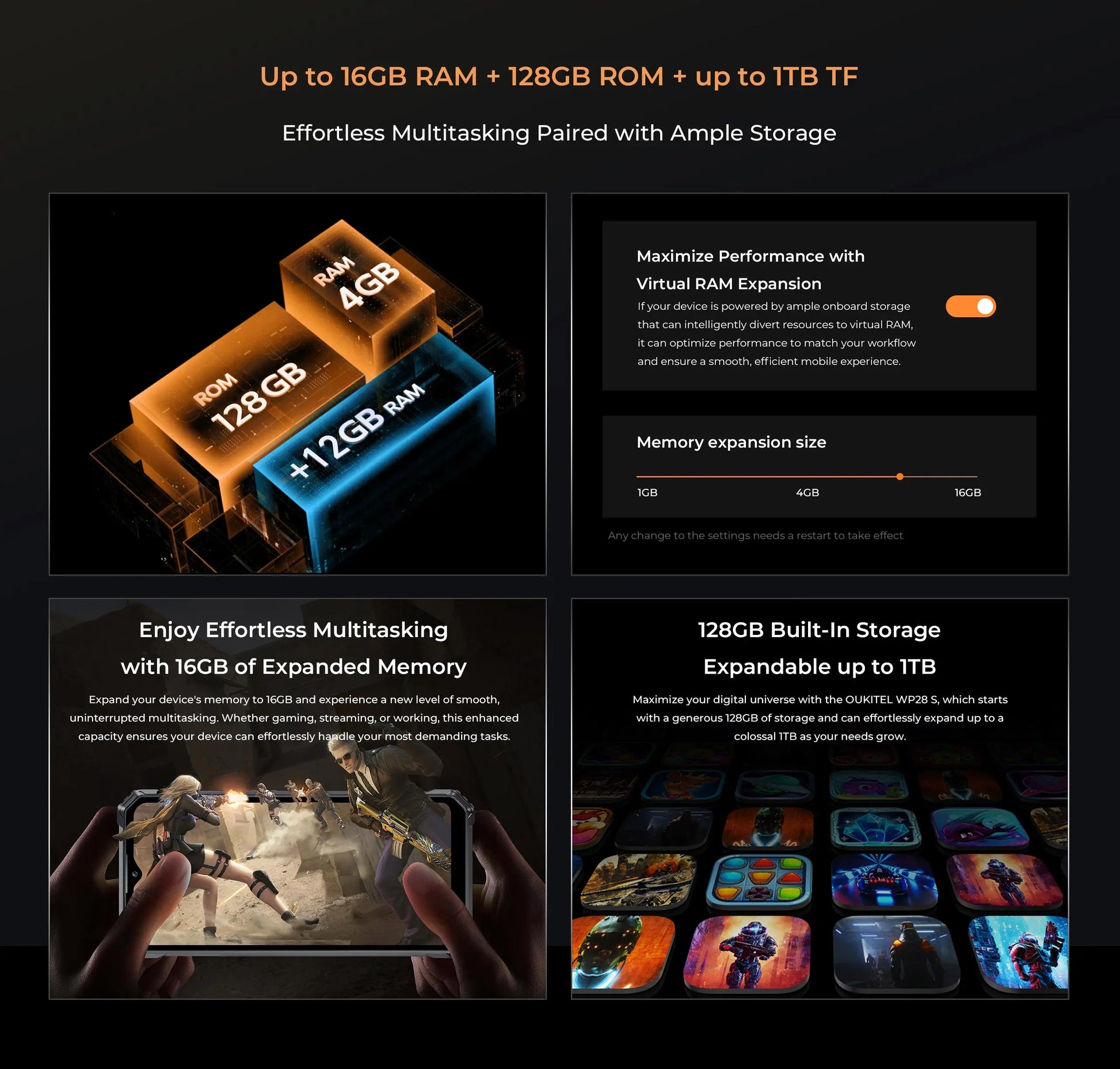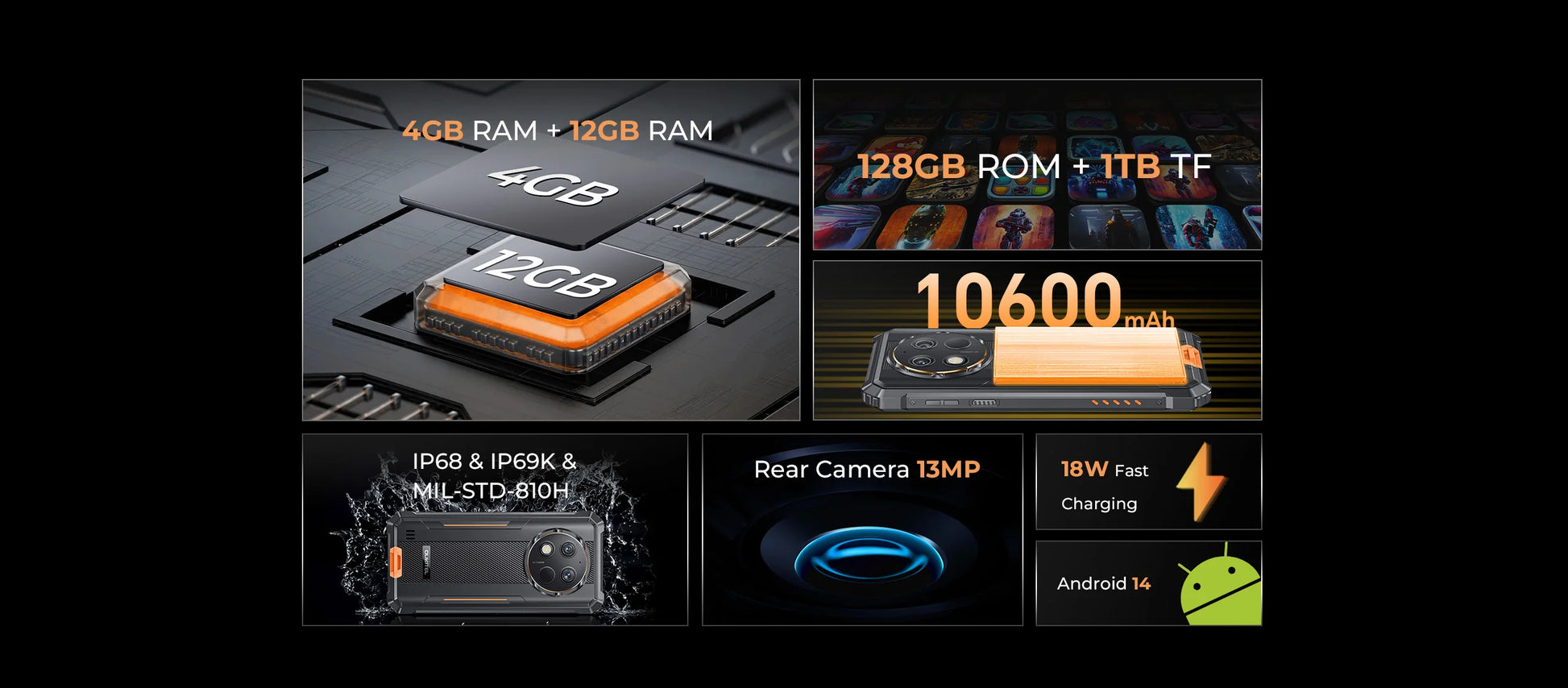 Oukitel WP28 S Rugged smartphone 6.52‘' HD 10600mAh 16GB (4+12)+128GB Android14 13MP Camera cellphone