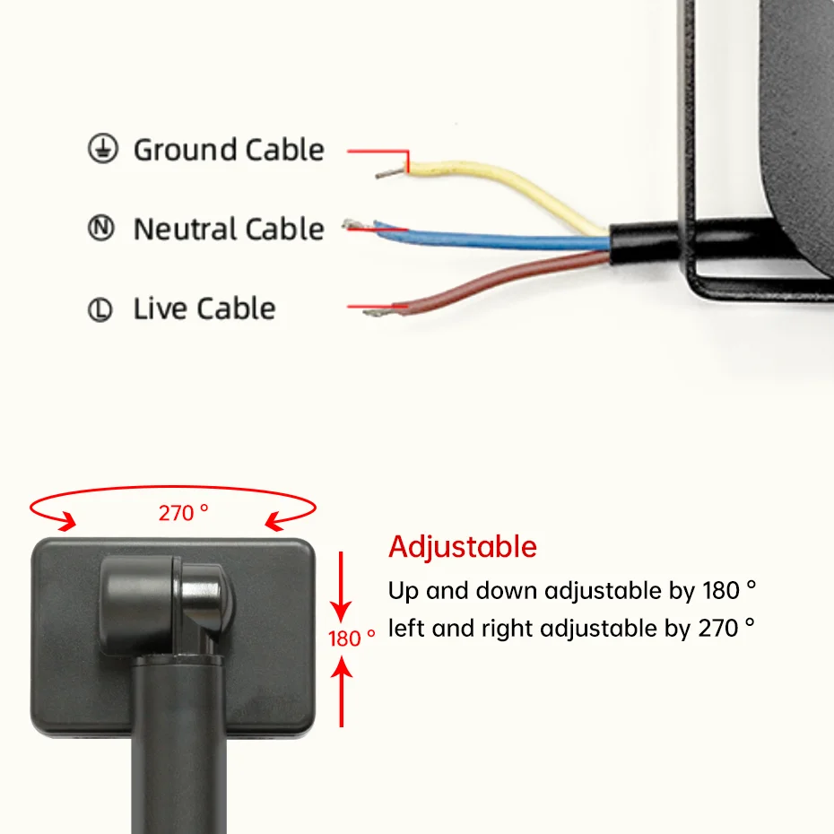 Adjustable metal bracket, can be applied to the wall, entrance, ceiling and other flexible installation methods by in different angles, it is recommended not to install on the ground, which will affect the induction effect; wiring color code: yellow wire - ground, brown wire - Live wire, blue wire - neutral wire.