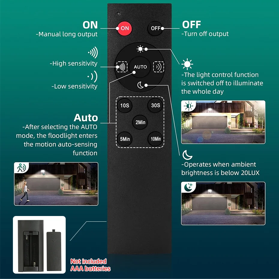 Paired with a high-performance infrared remote control, it can achieve remote control of sensing floodlights within a range of 8-10 meters, no longer limited to a single sensing mode. Can enter all-weather sensing mode or sensing automatic mode (power-saving mode). You can also set the light to turn off at different times after the person leaves the sensing area. Make your sensor's floodlight function more intelligent and versatile.