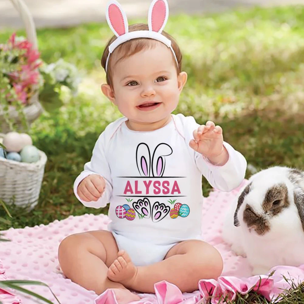 Personalized Easter Baby Romper Bunny with Name Infant Outfit Bodysuit Boys Girls Holiday Party Jumpsuit Bunny Newborn Rompers