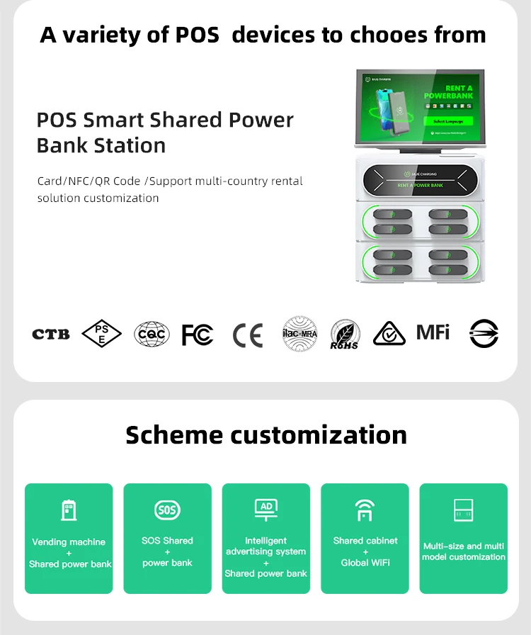 User scan the Qr or Swipe card through POS card reader, then the powerbank will pop out, user take it and charge on the go,When users return it to the charging pile, the power bank will automatically charge. And you can set the deposit and price for users according to time, and make a profit from the rent. If the customer does not return the charging station, the deposit will not be refunded.