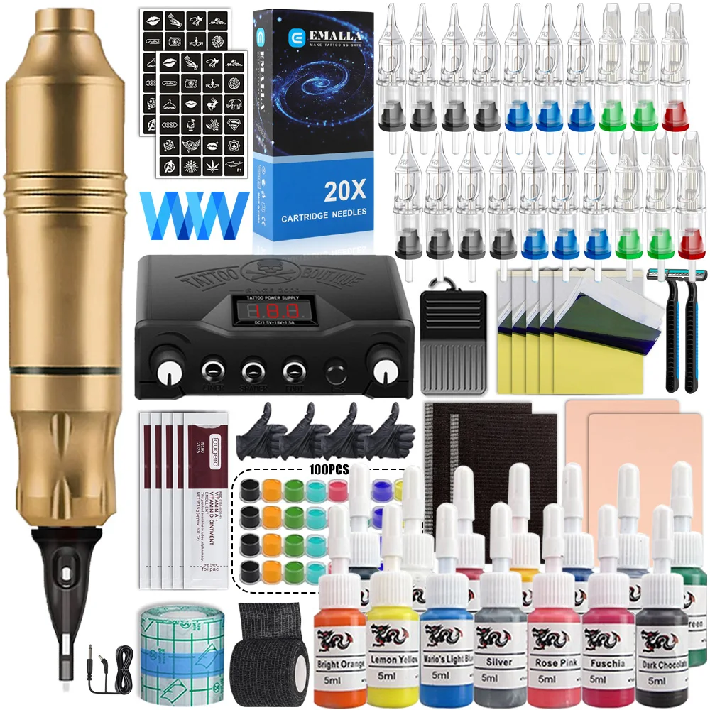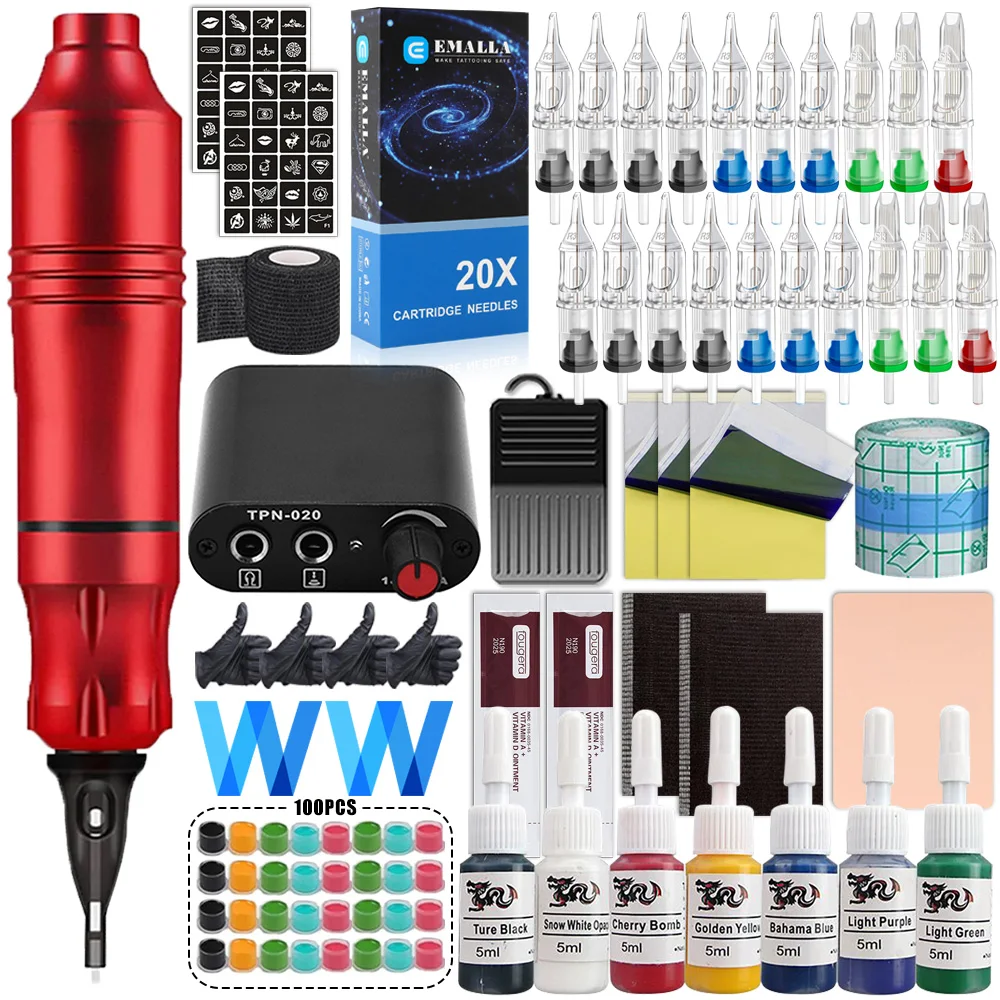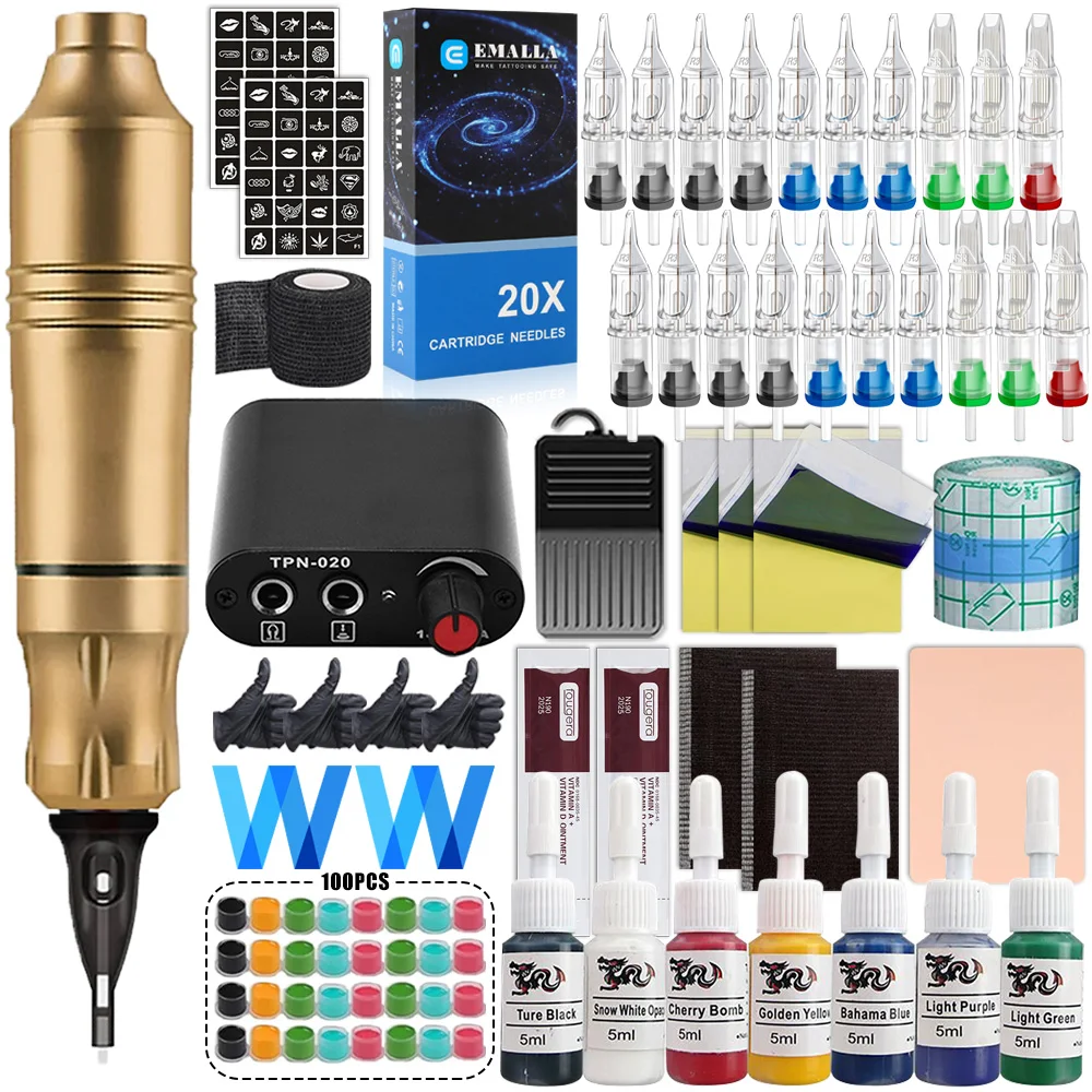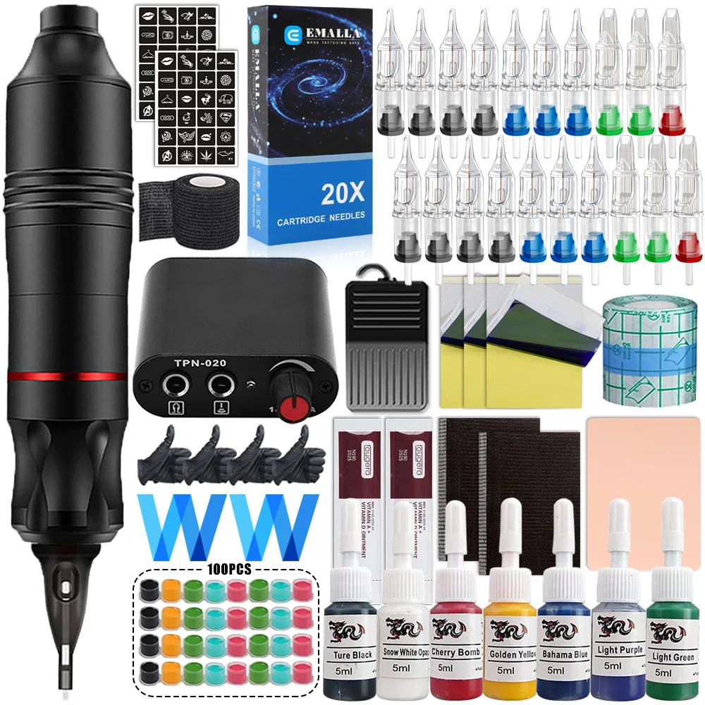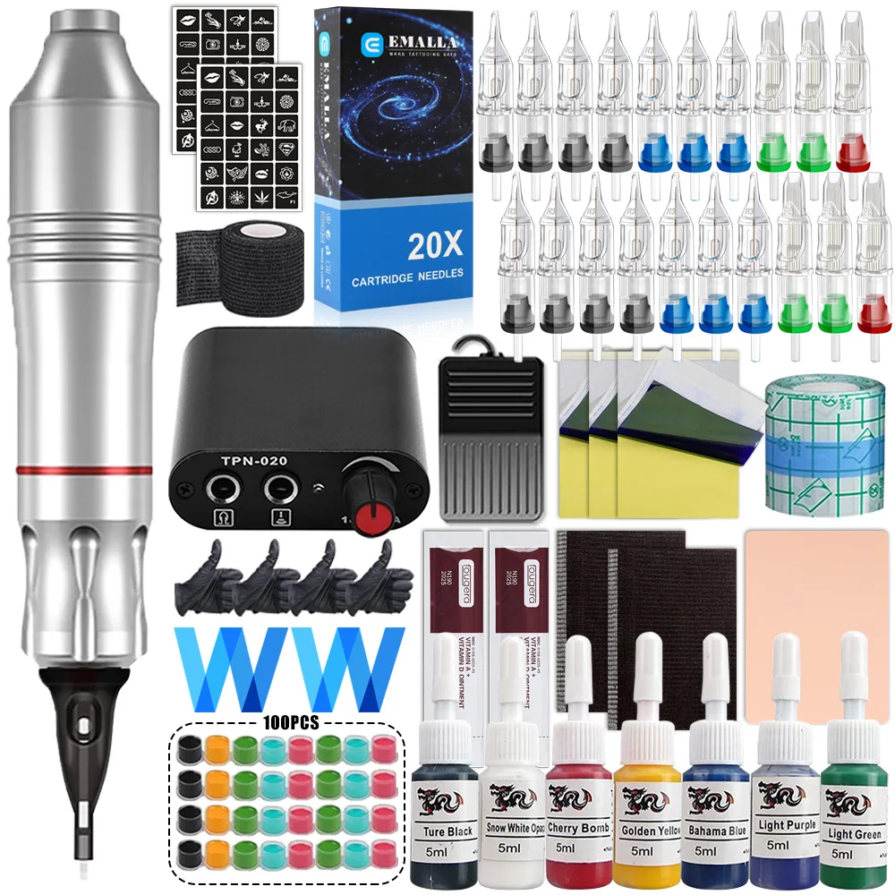 Professional Tattoo Machine Pen Kit with Cartridge Needles Power Supply Tattoo Inks Rotary Tattoo Pen Set for Beginners Body Art