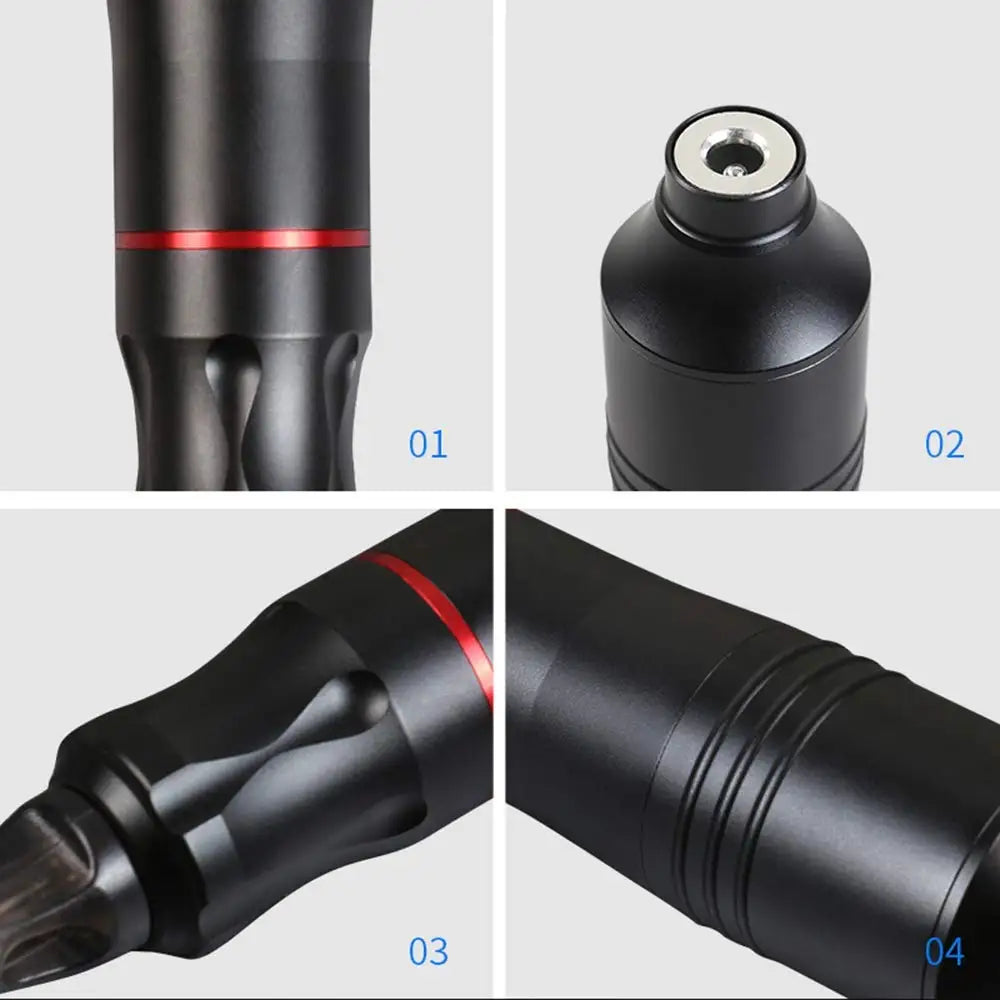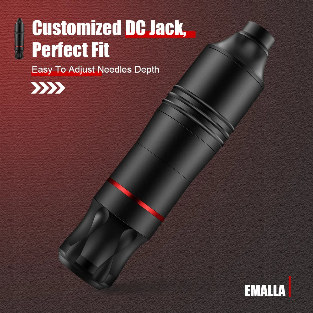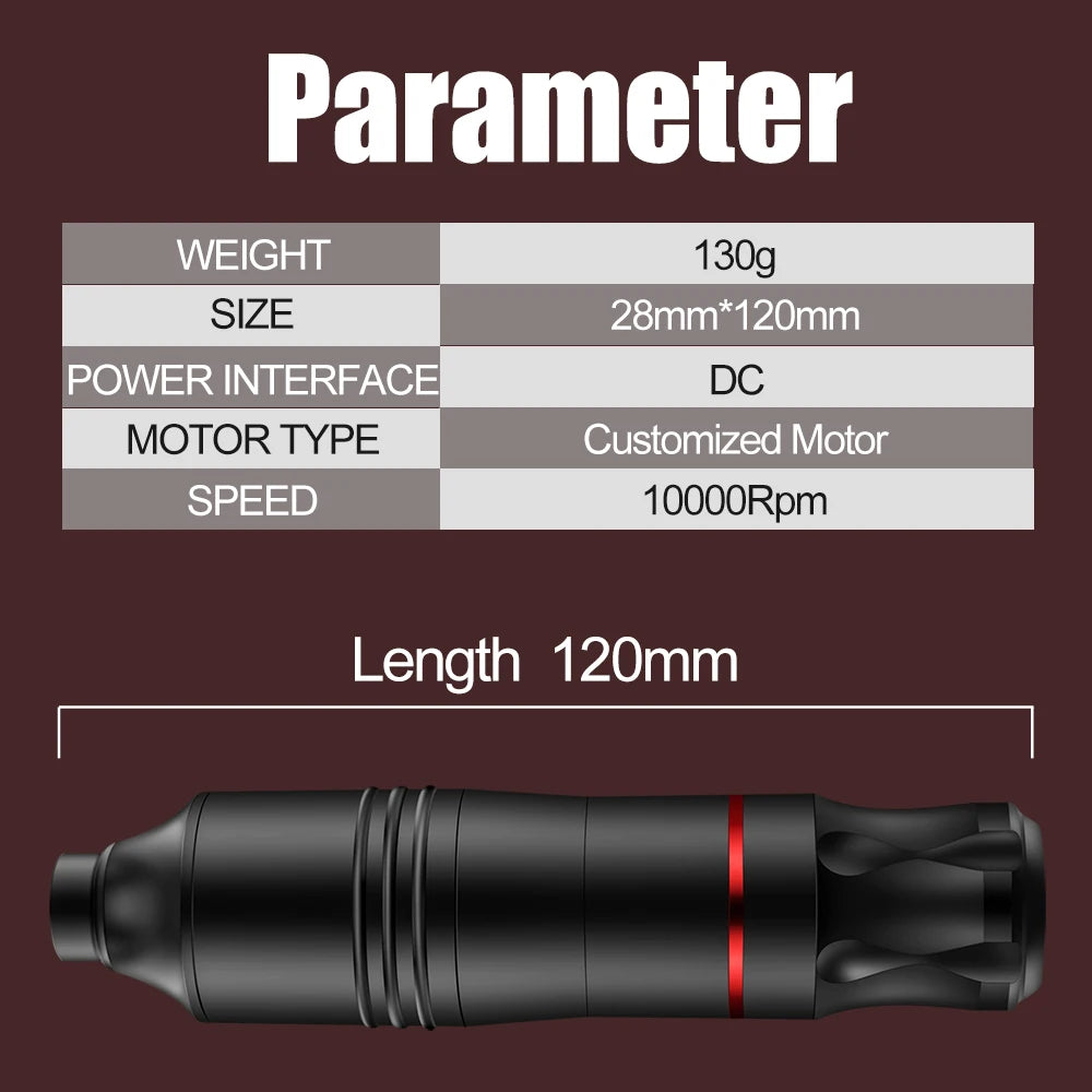 【ROTARY TATTOO MACHINE PEN】- Beginner rotary tattoo machine pen gun with premium aluminum alloy, 3mm stroke fit most of tattoo styles, DC jack, one-piece carved. Features a customized iron core motor, large power, stable output, fast coloring, continuous operation not hot, low noise. Non-slip design, compatible with most tattoo cartridge needles.