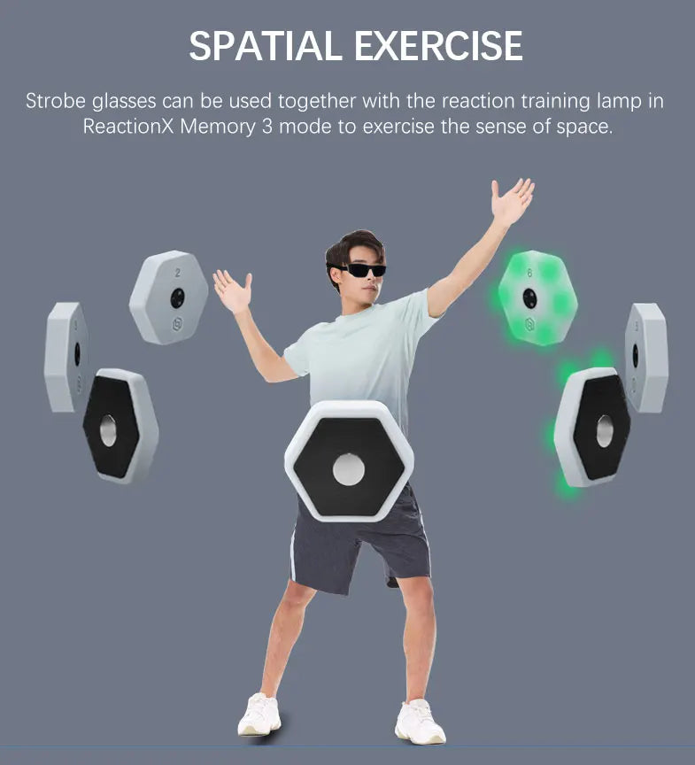 The reaction training light requires additional purchase. You can purchase it from other links in the store. We can use it in the ReactionX application to use Memory 3 mode and work with the reaction training light to enhance the sense of space. When the light is on, you need to remember the position of the light. When the light is off, the glasses will turn black. You need to find the position where the light was just on in the dark