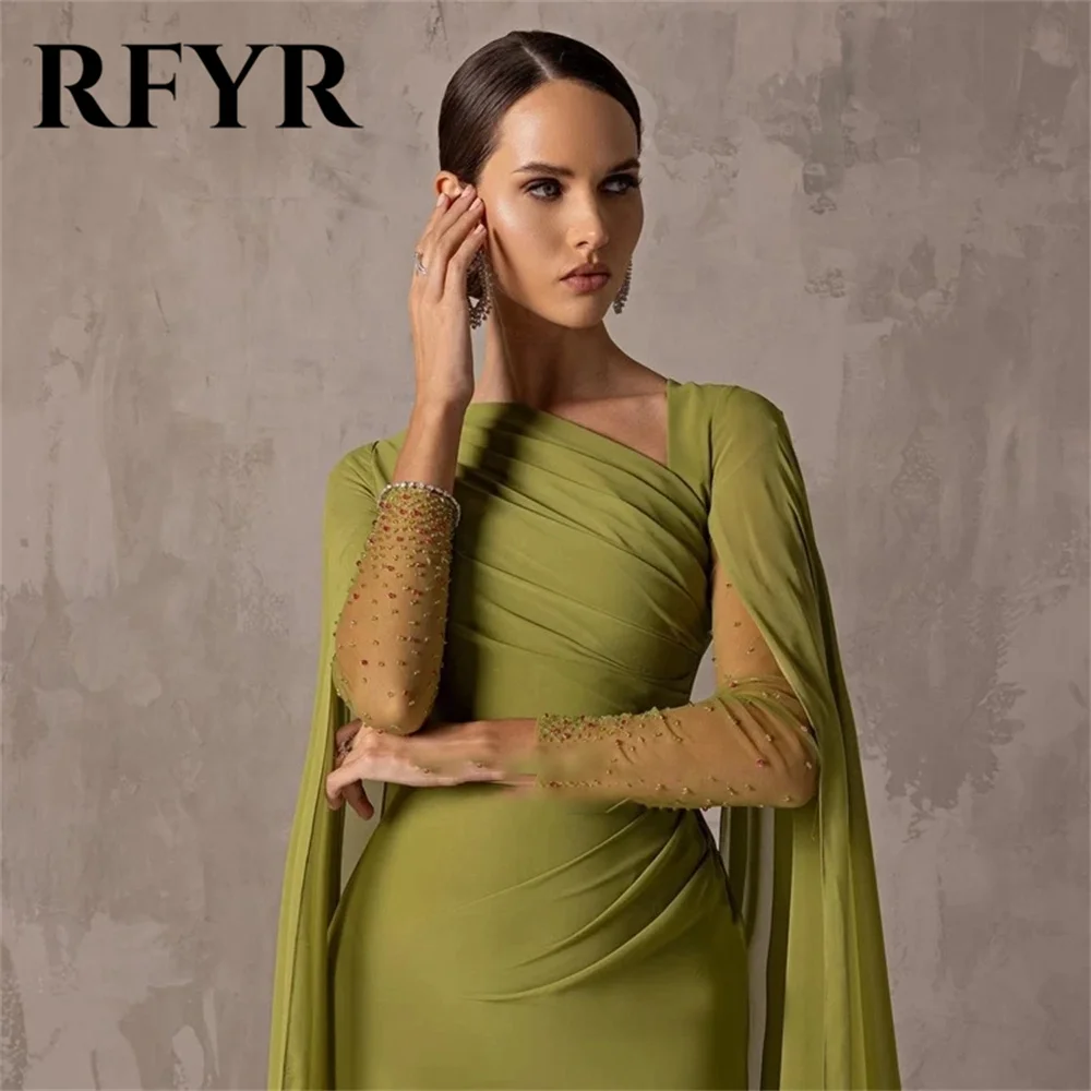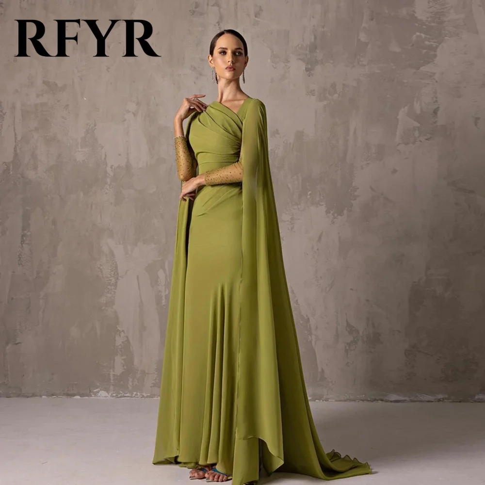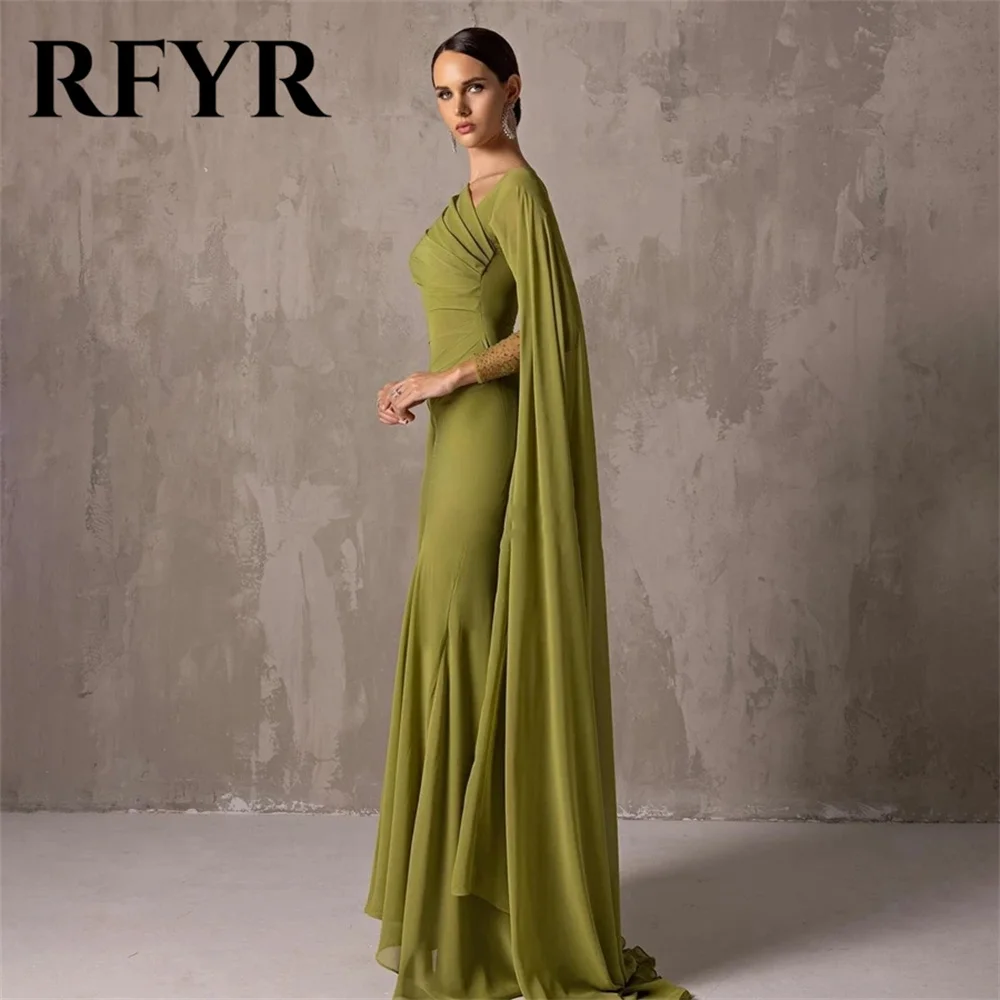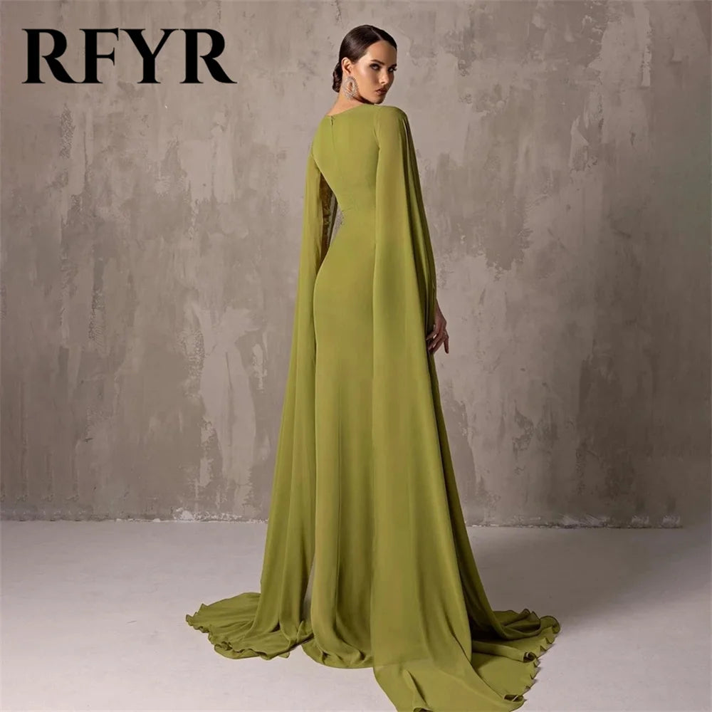 RFYR One Shoulder Chiffion Green Prom Dress Elegant Mermaid Evening Dress with Long Cape Arab Dress Vestidos De Noche Customized