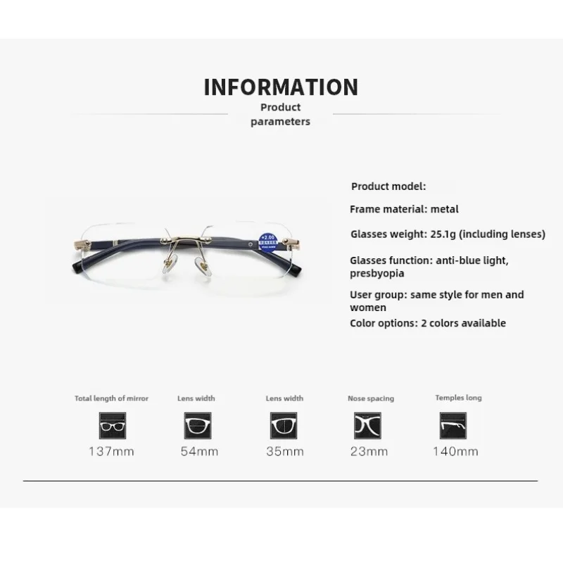 Rimless Frame Reading Glass for Men and Women with Grade +100°~+400°