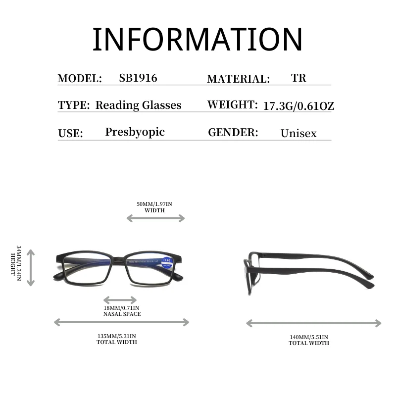 SB1916 1pc True TR Material Squared Frame Good Quality Presbyopia Fashion Unisex Corrective Eyeglasses Reading Glasses