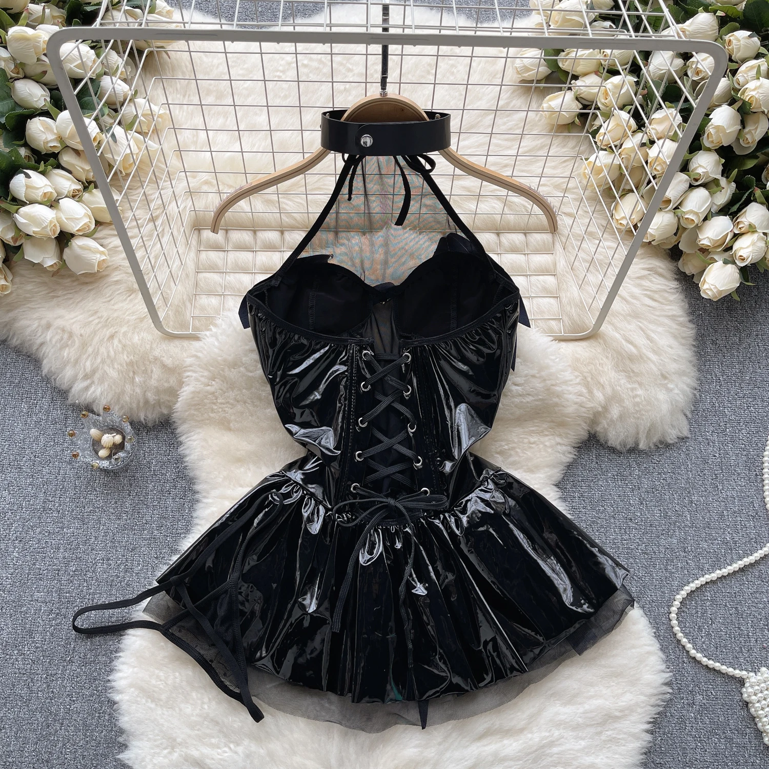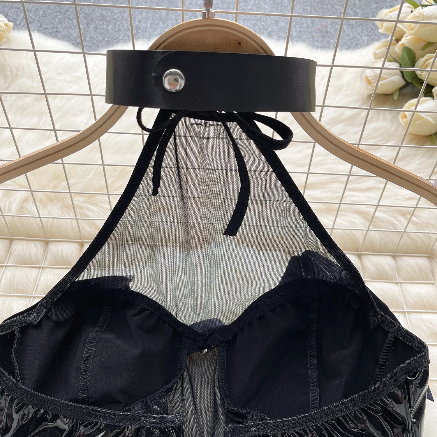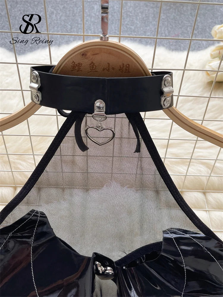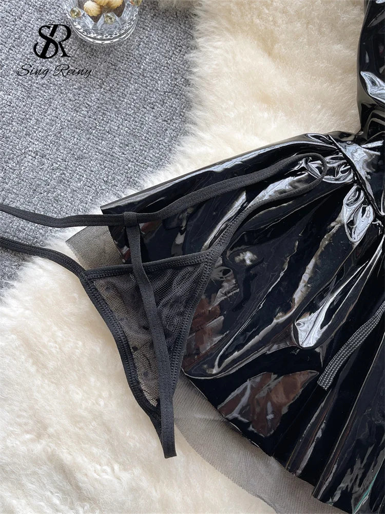 SINGREINY Women Pu Leather Sensual Dress Halter Lace Up A Line Sexy Nightdress+Thongs Sheer Backless Mini Porn Nightwear
