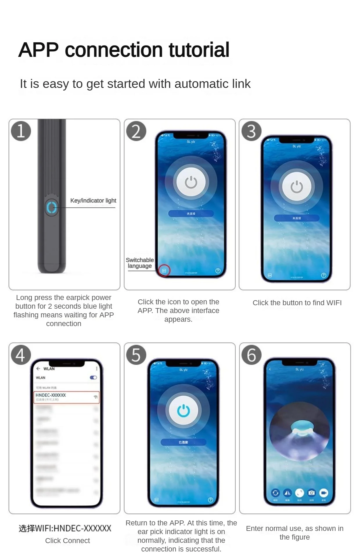 - 【Smart App Connection】 Scan the QR code and download the APP. Press and hold the switch button to turn it on, and connect the ear cleaner and APP through WiFi, and video transmission rate up to 30FPS, The ear cleaner camera is compatible with iOS / Android devices. You can also take photos or shoot videos and save them in the album.