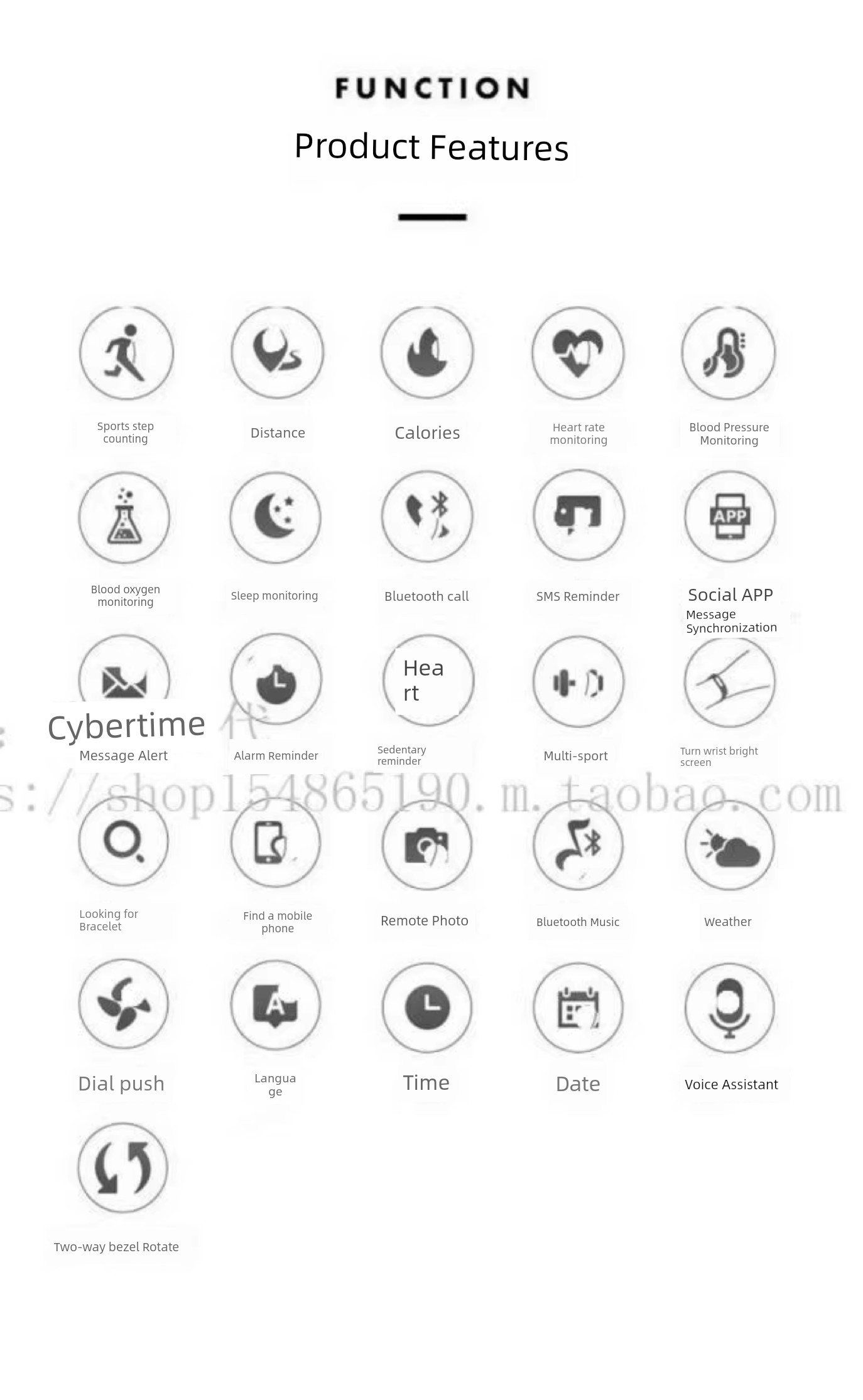 Function: Remote control selfie,Blood pressure monitoring,Motion tracking,Alarm,Bluetooth call,Step counting,Information push,Heart rate monitoring,Blood oxygen test,Smart reminders,Sleep monitoring,Waterproof