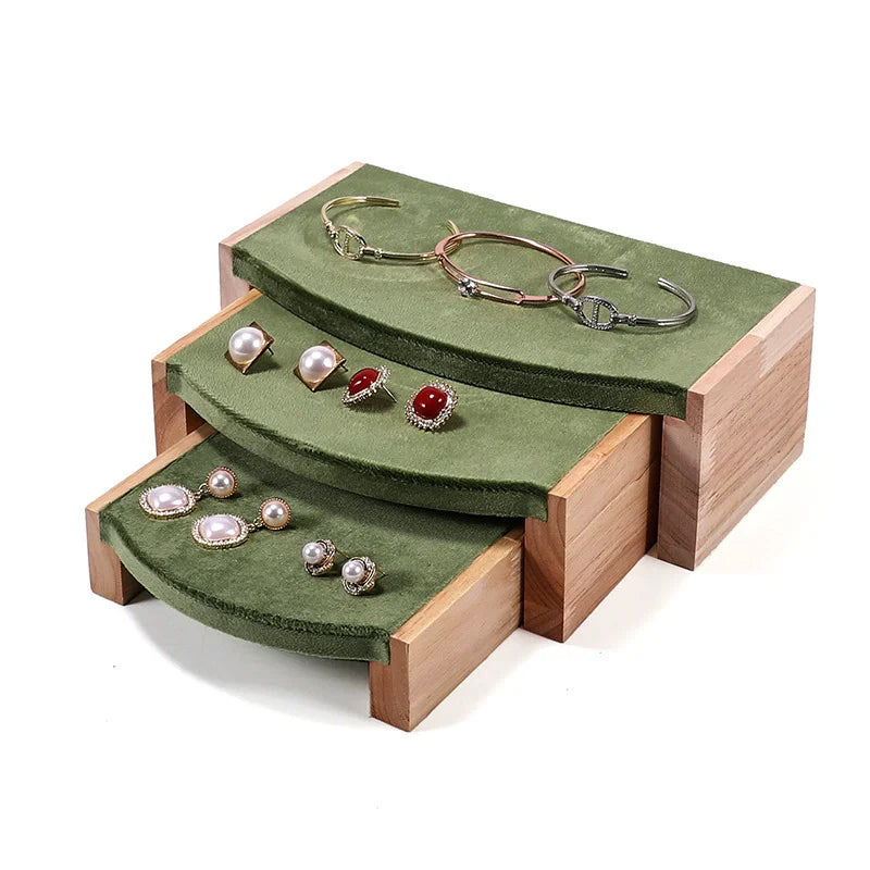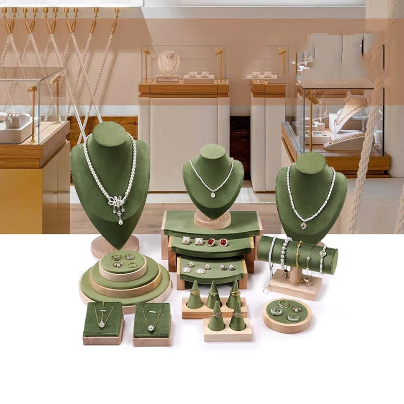 Solid wood green velvet jewelry display stand ring stud necklace pendant bracelet storage and display stand