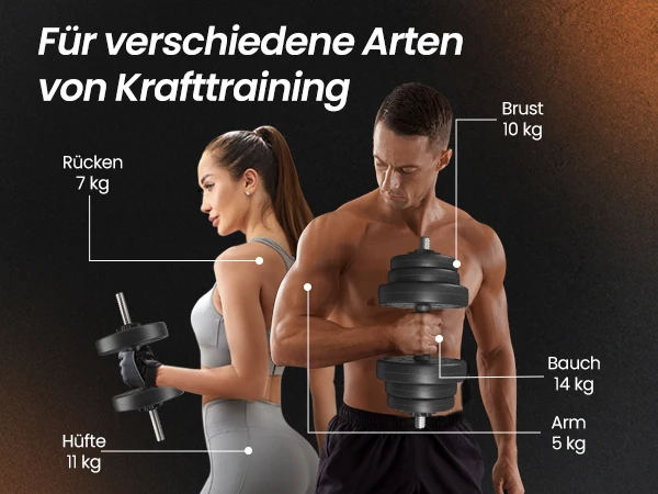 [Flexible use] Total weight with accessories: 20 kg, including 4x2.5 kg disc, 4x1.25 kg disc, 4x1 kg Disc, 2 dumbbell bars, 4 star caps and a barbell for 2x10 kg dumbbell or a 20 kg barbell