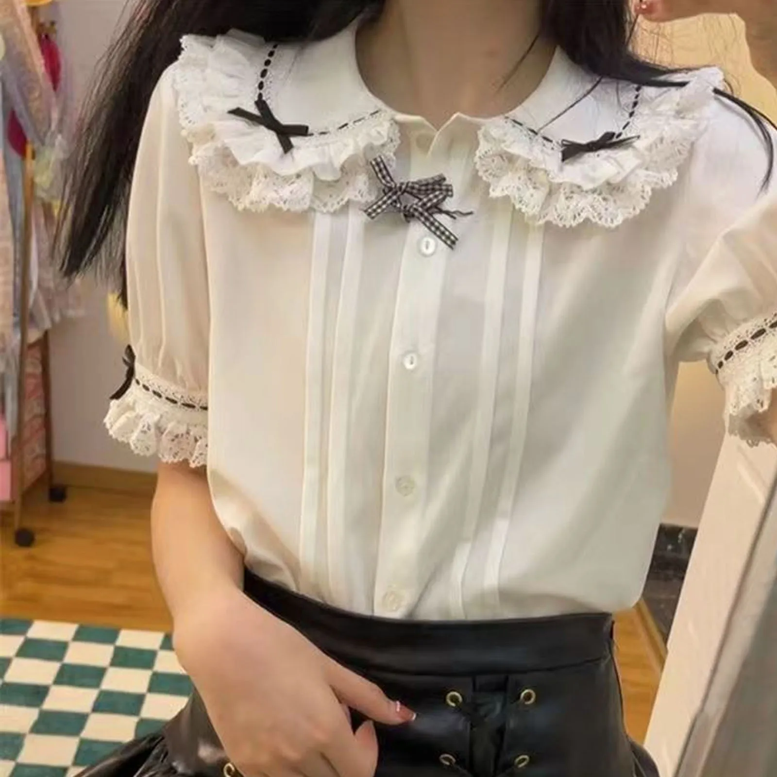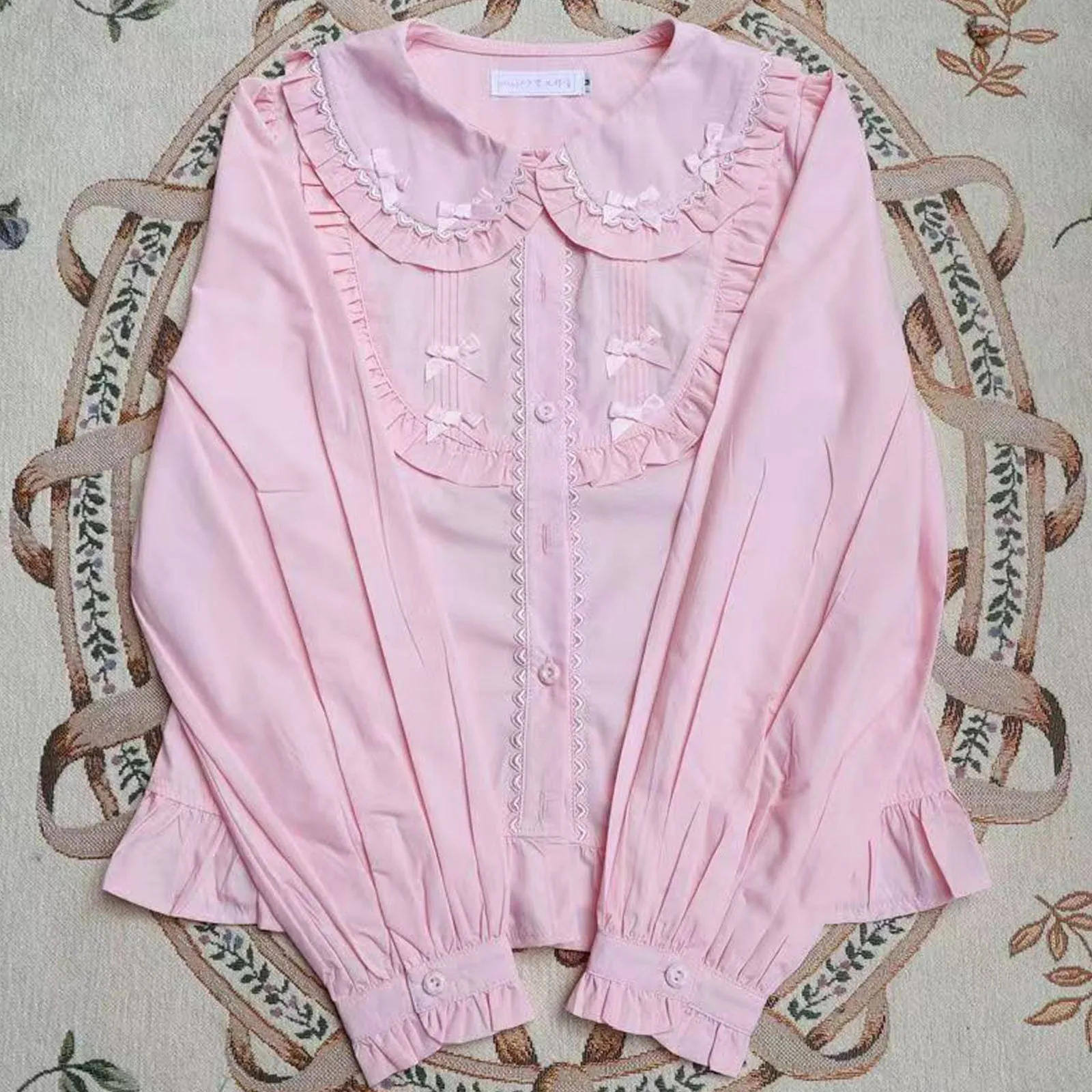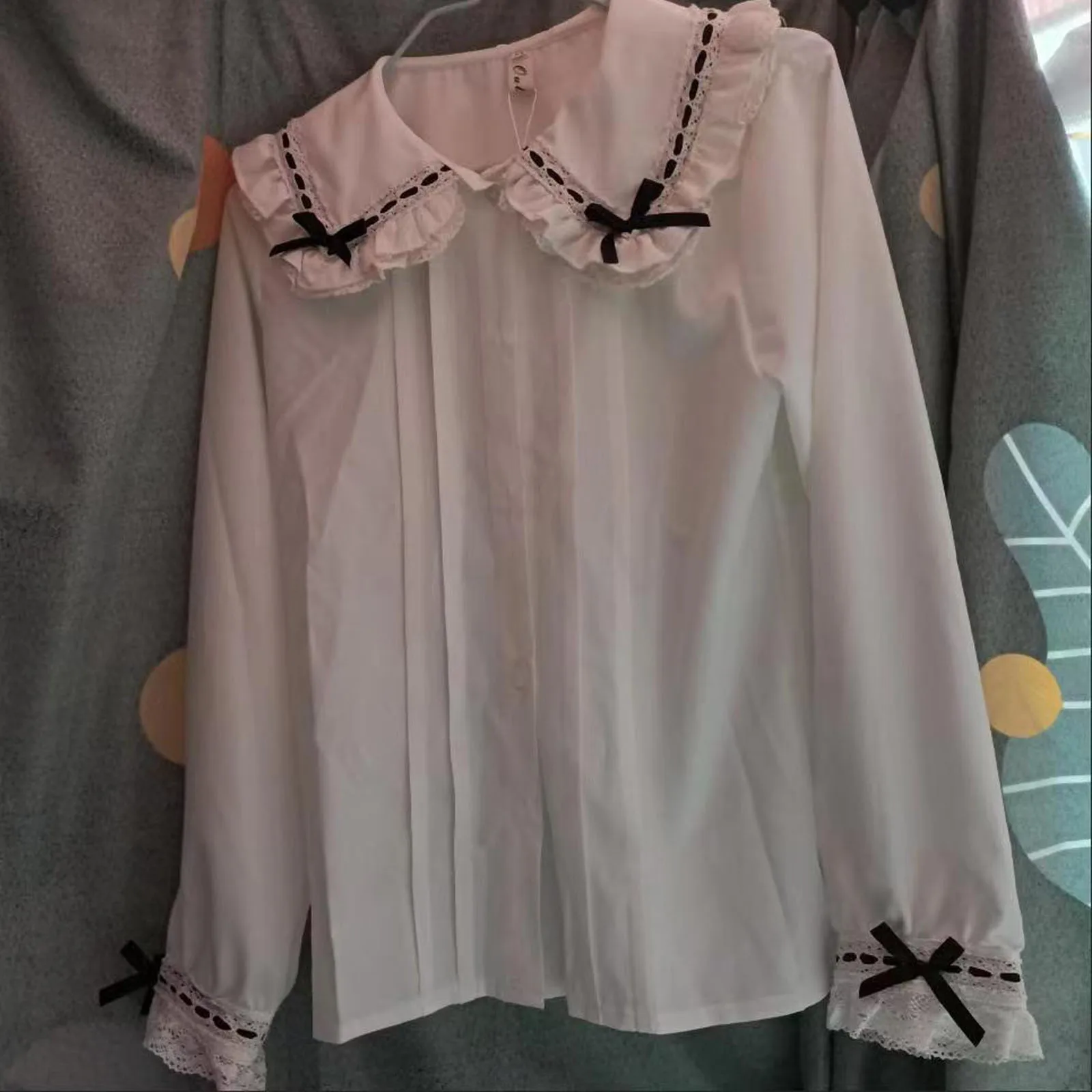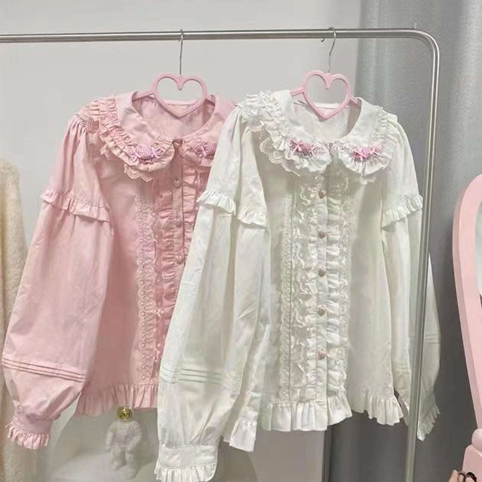 Spring Blouse Women Japanese Kawaii Cute Lace Patchwork Peter Pan Collar Shirt Vintage Sweet Embroidery Top Blusas