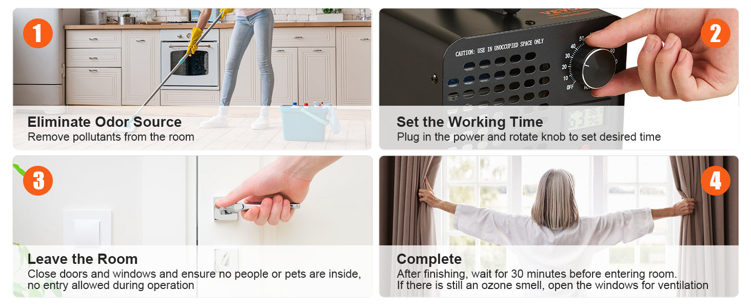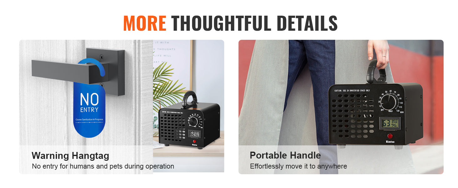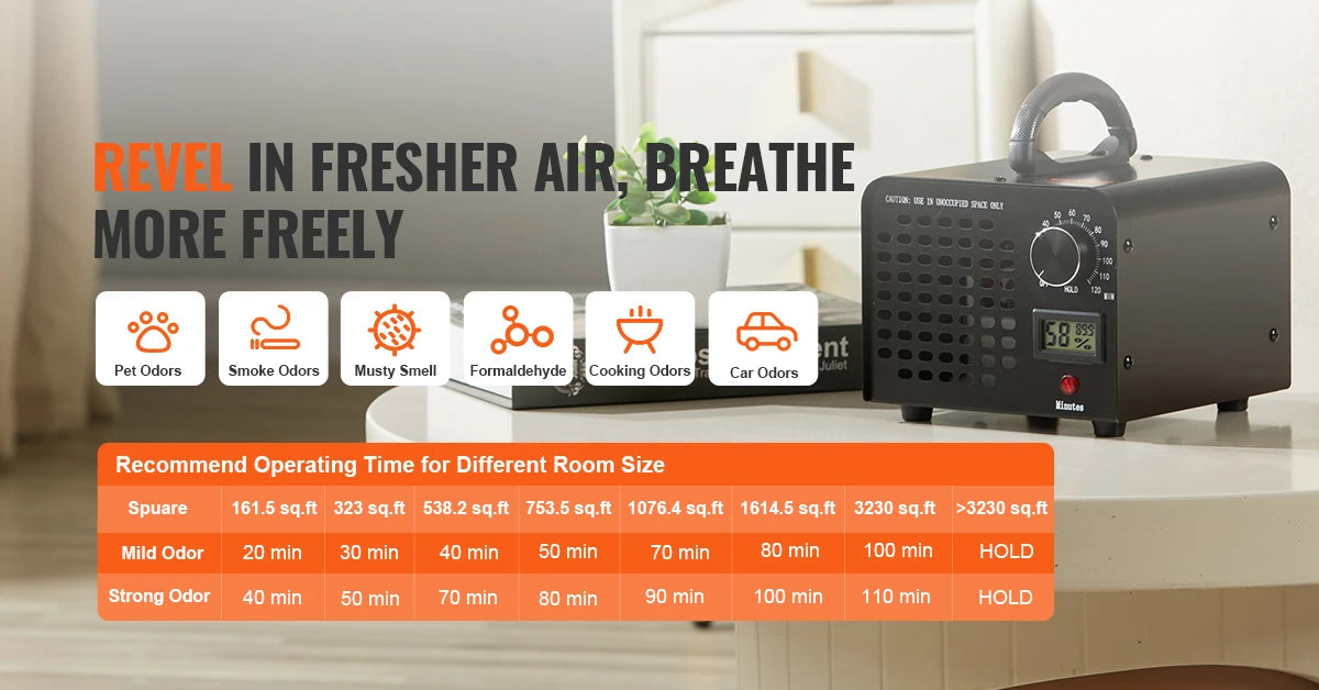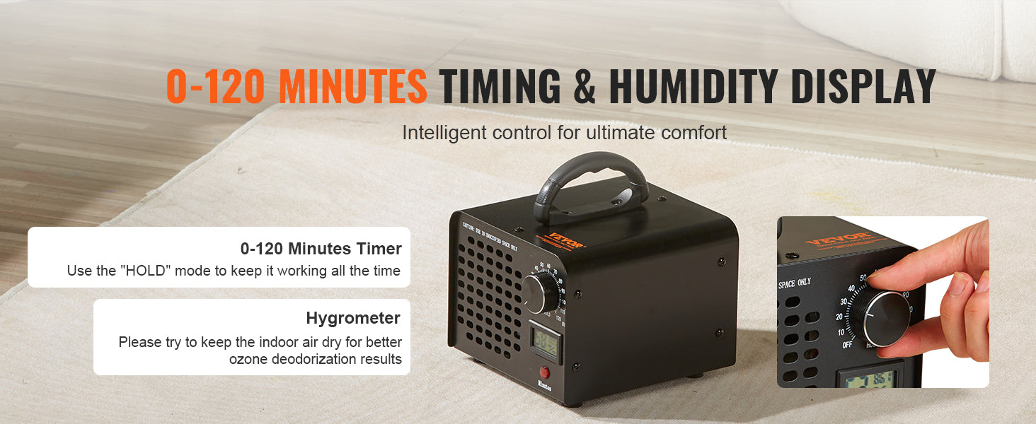 Intelligent Timing Control: This commercial ozone generator machine comes with humidity display and 0-120 minute timer function. You can customize the required operating time for up to 120 minutes, and use the "HOLD" mode to keep it working continuously. The humidity reminder will also prompt you to maintain dry indoor for better odor removal effectiveness.