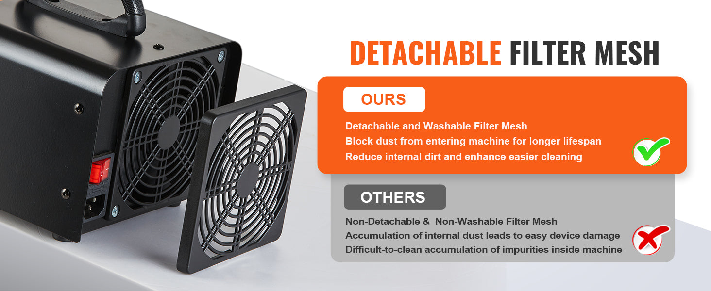 Safe and Easy Maintenance: Our ozone machine odor remover features a considerate, detachable filter mesh design, allowing you to clean it at your convenience, ultimately extending the lifespan of the device. Its stable purification performance not only offers you enhanced safety in mind but also assures effective ozone production.