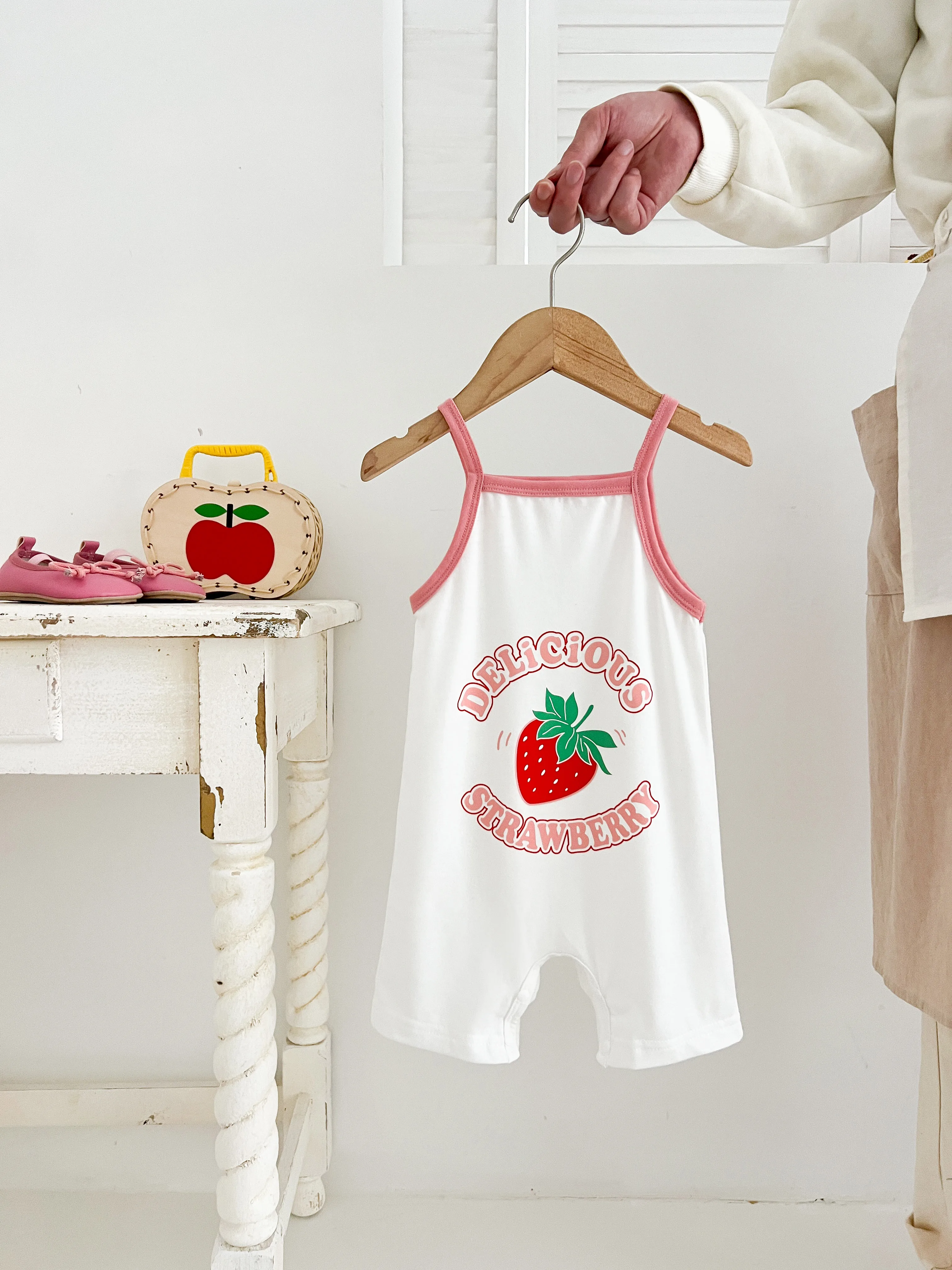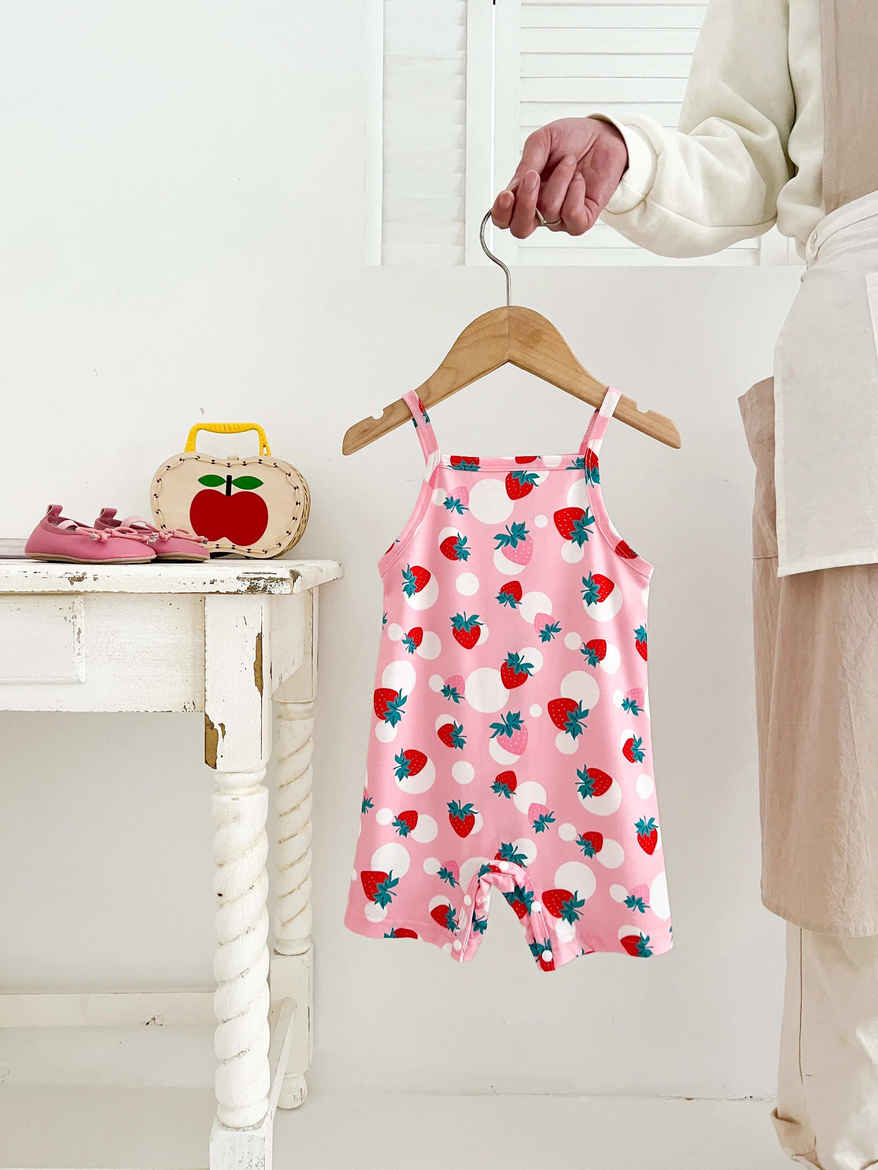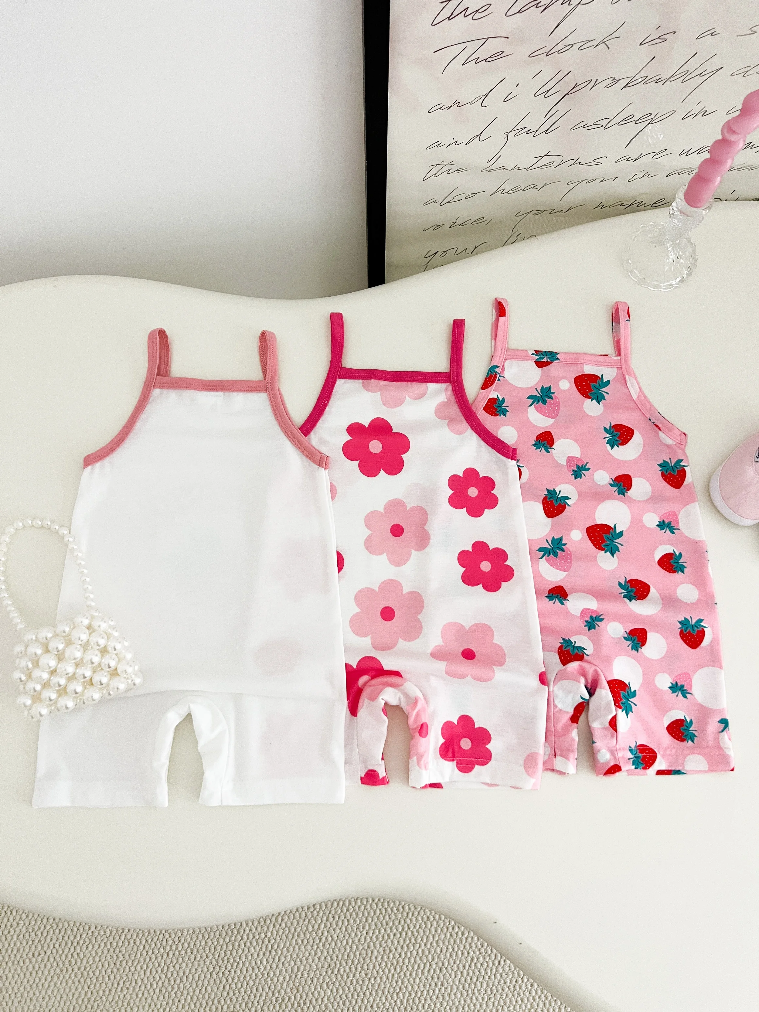 Summer 0-1 Years Old Infant Baby Girls Fruit Print Camisole Jumpsuit 3-Piece Set , Suitable For Daily Wear
