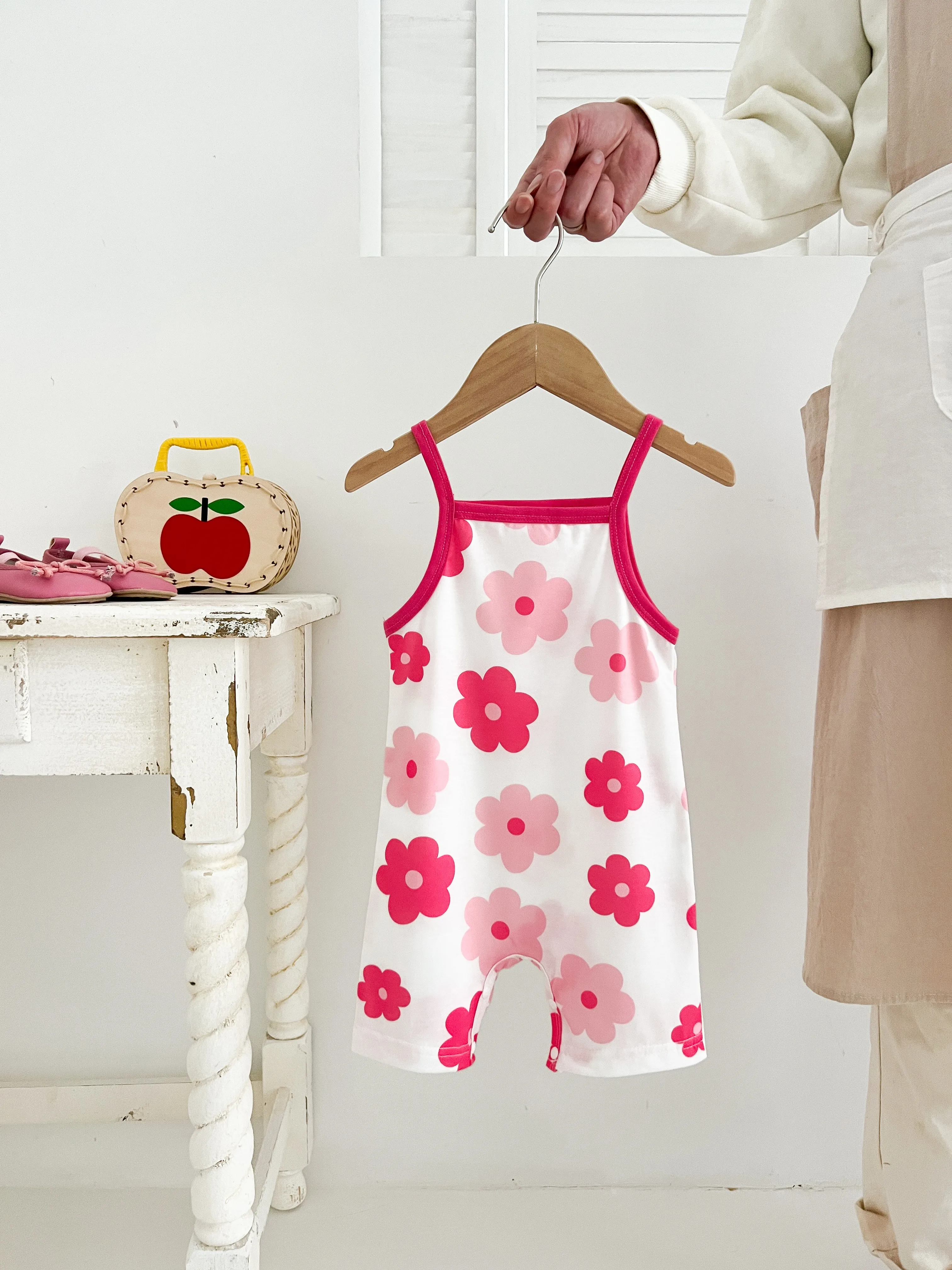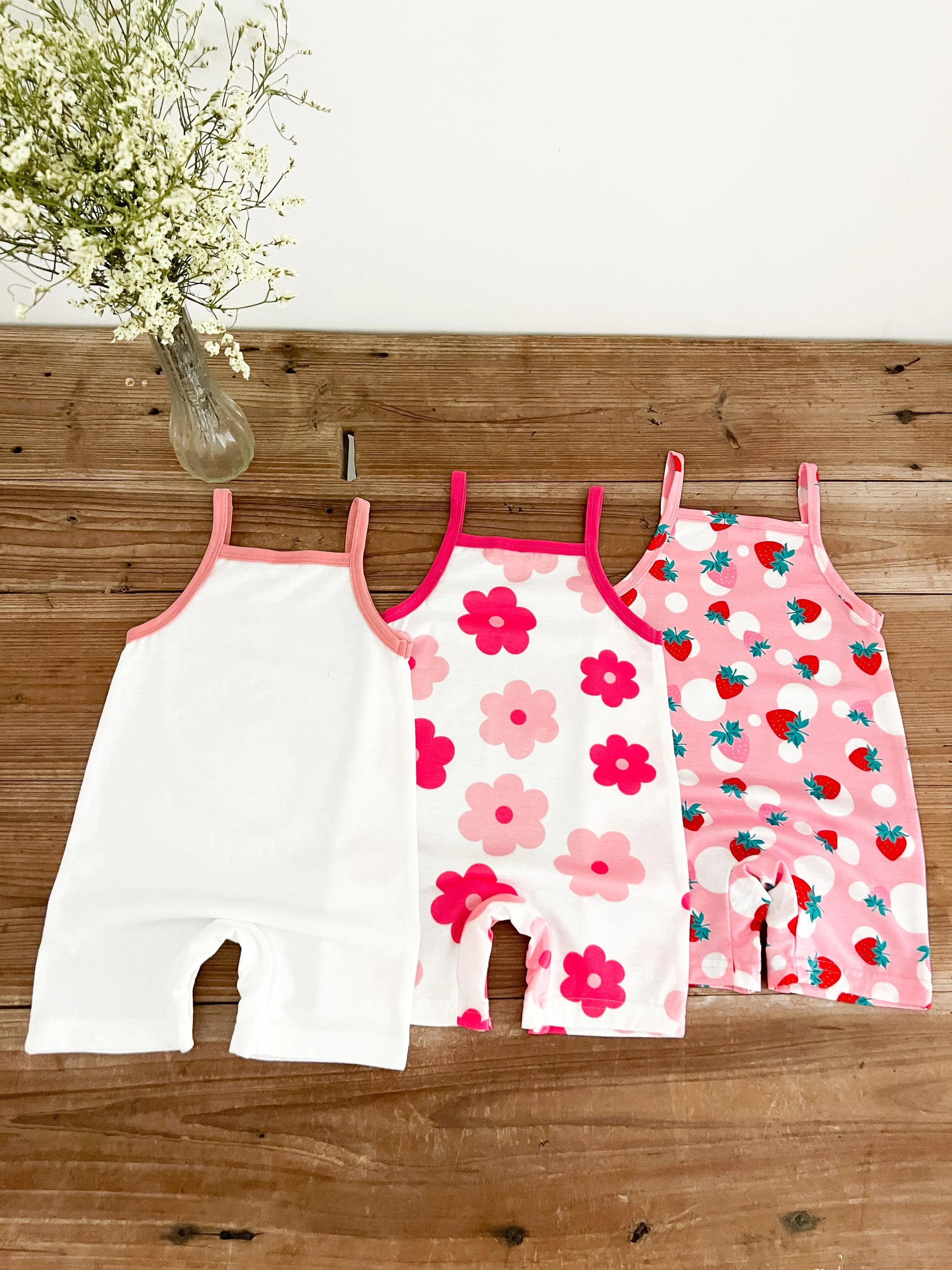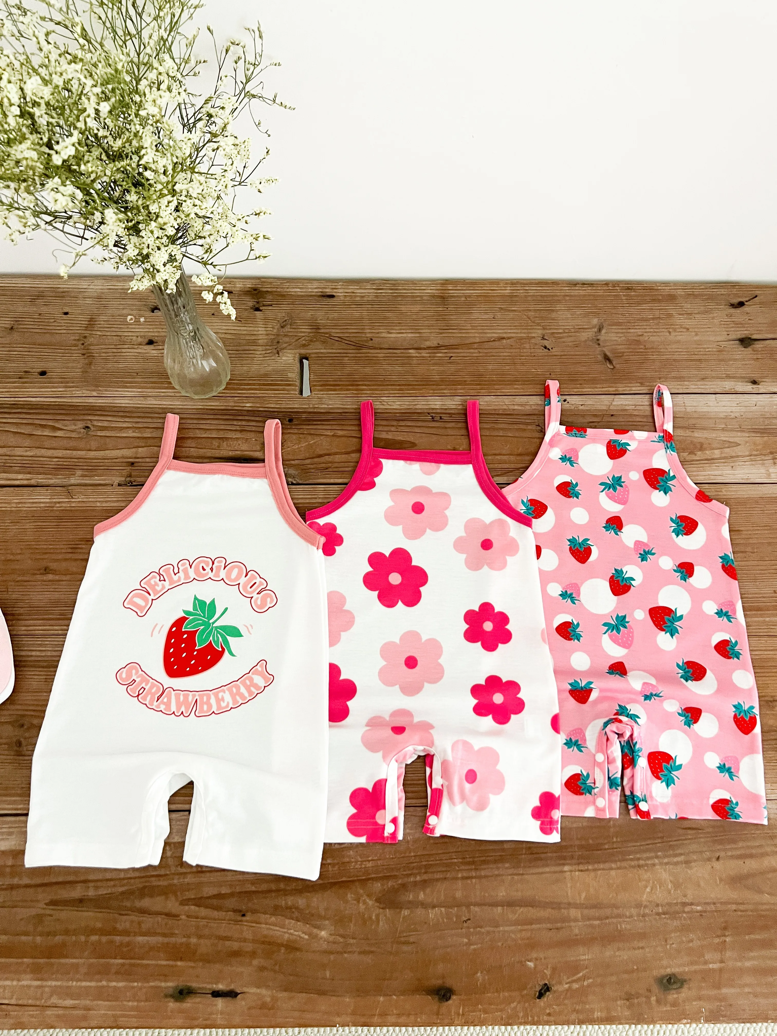 Summer 0-1 Years Old Infant Baby Girls Fruit Print Camisole Jumpsuit 3-Piece Set , Suitable For Daily Wear