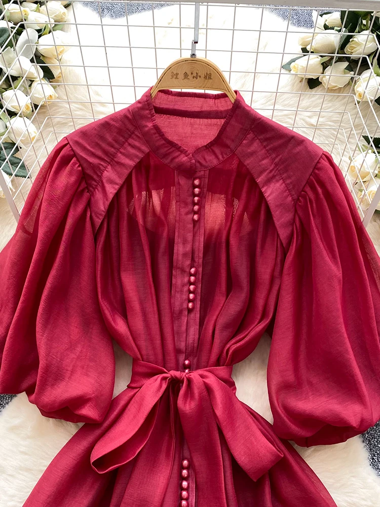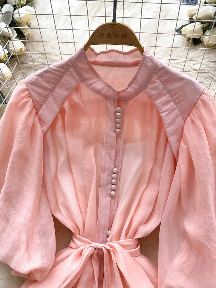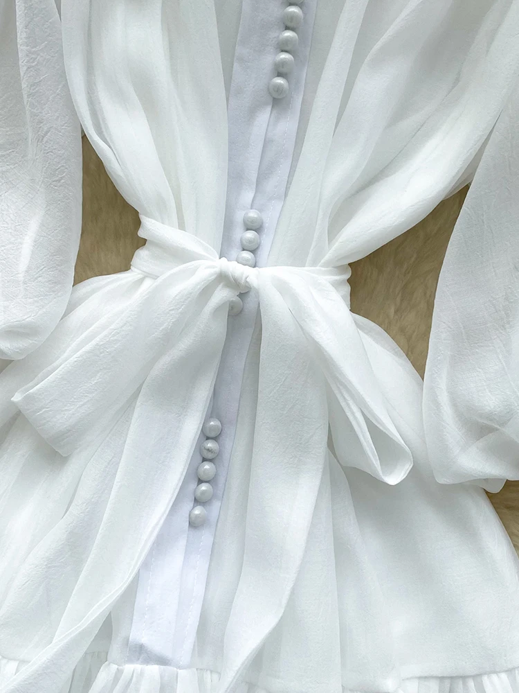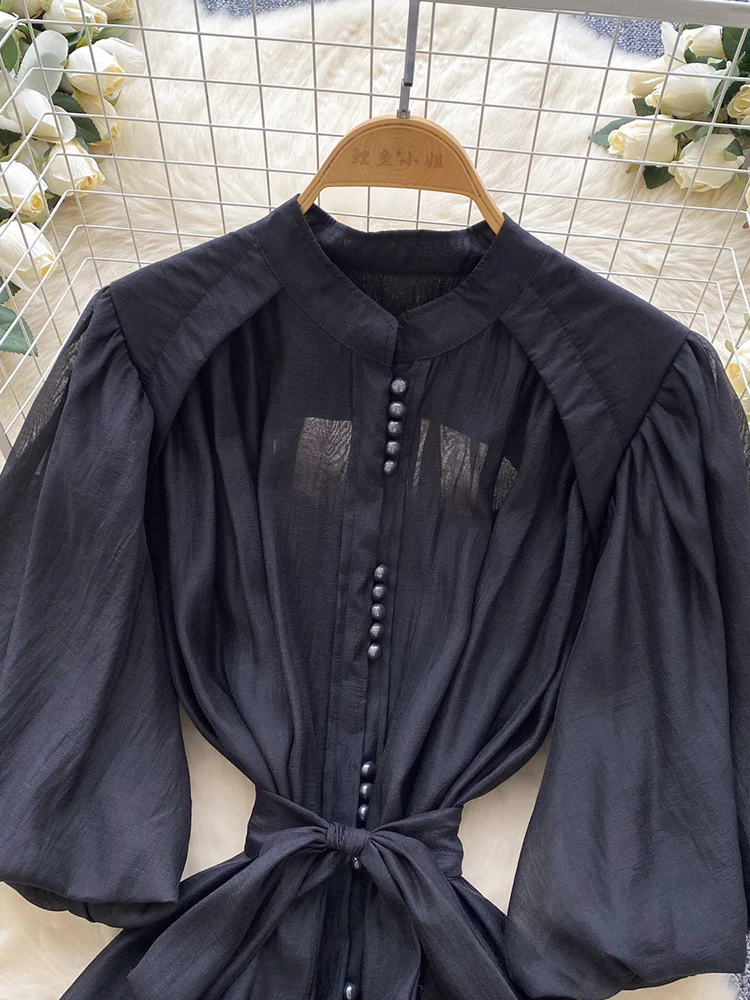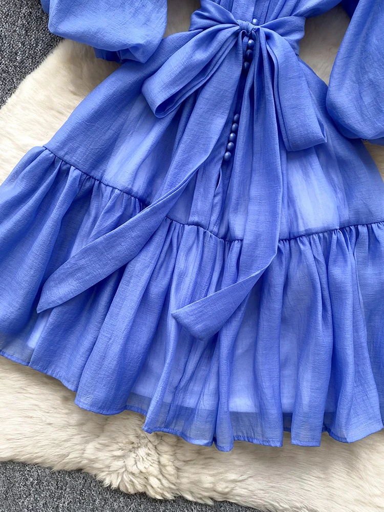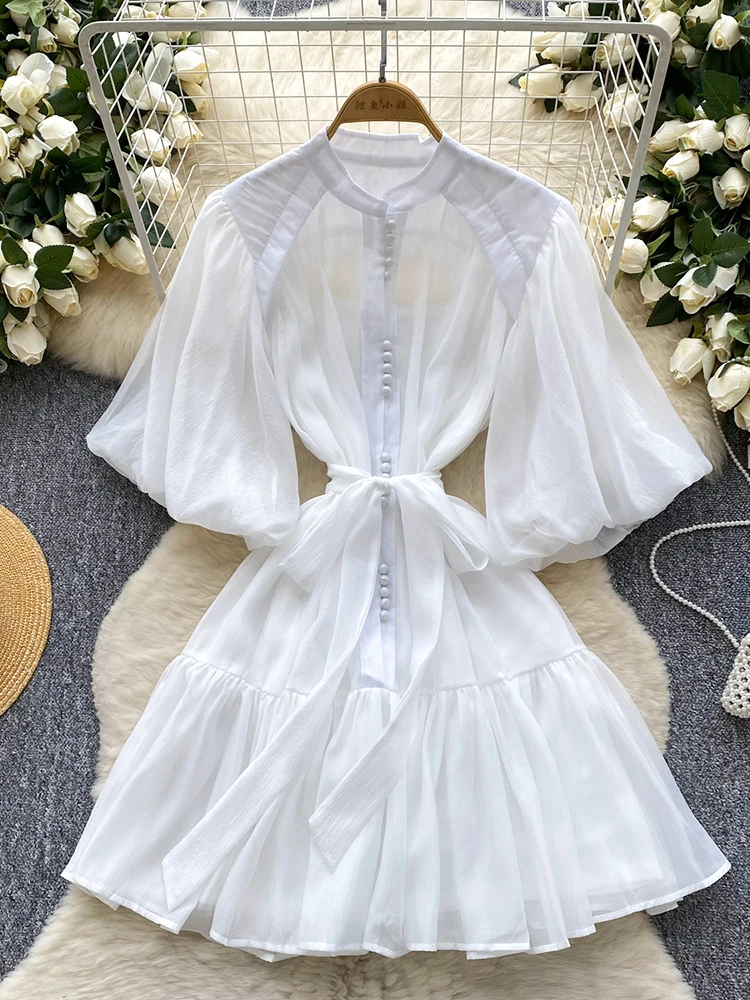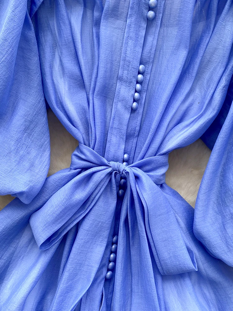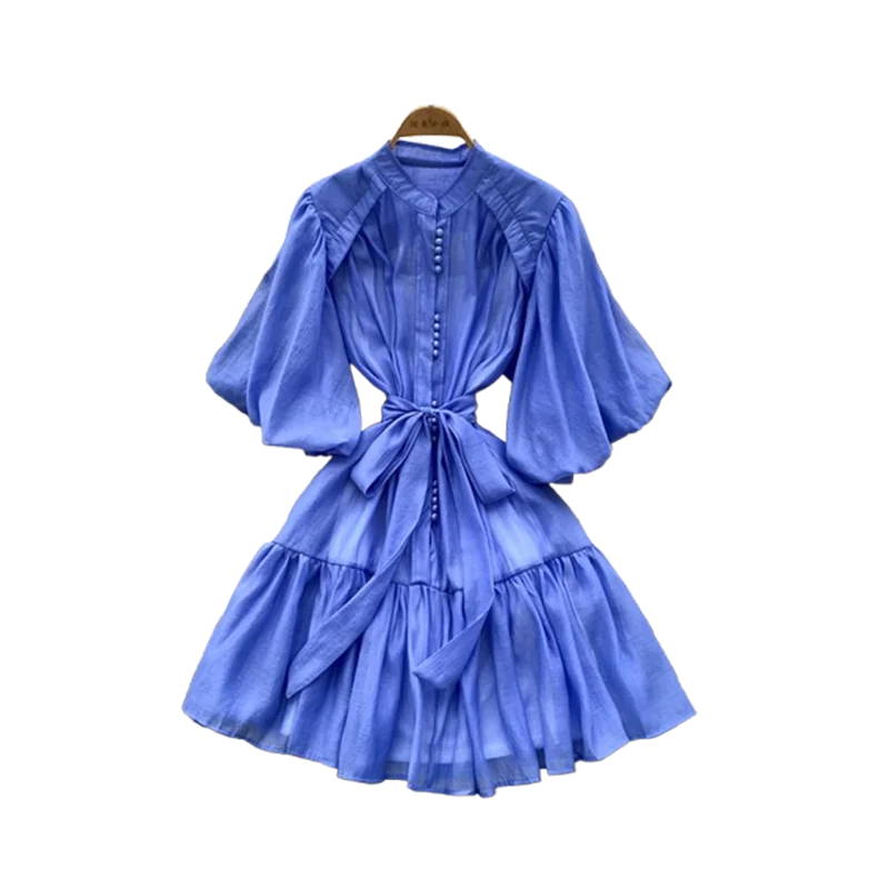 Summer Women's Puff Sleeve Shirt Dress Fashion Beach Vacation Party Birthday Blue White Exquisite Chiffon Mid Length Dress B06