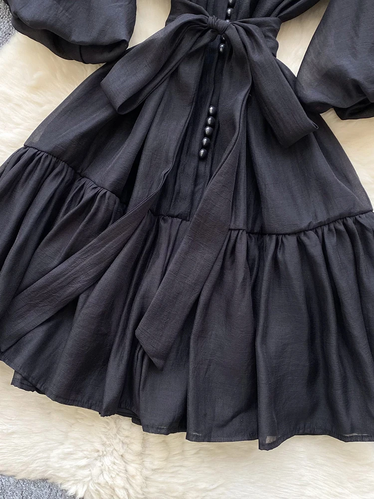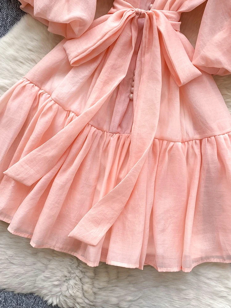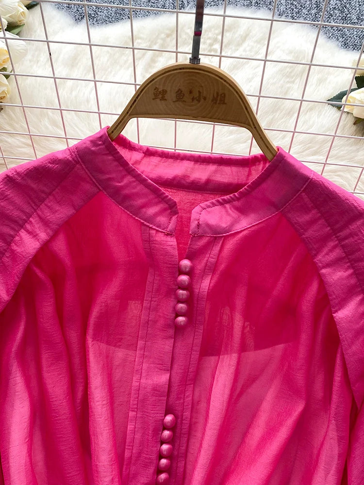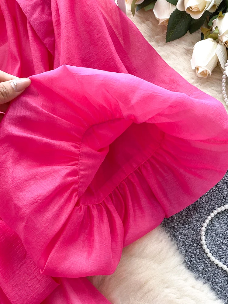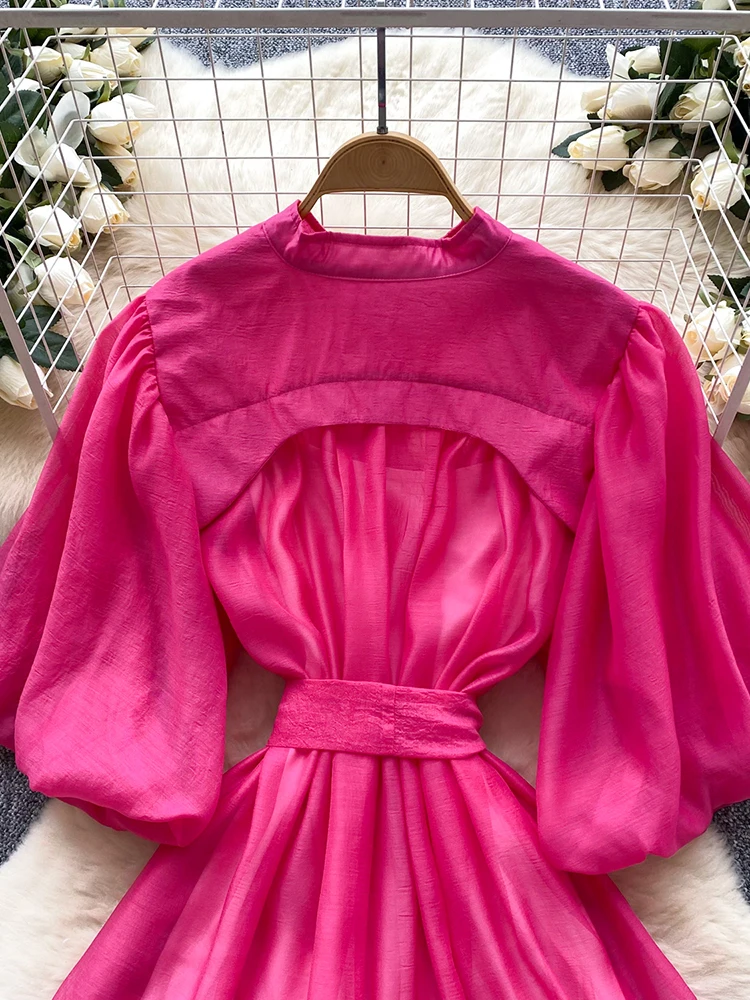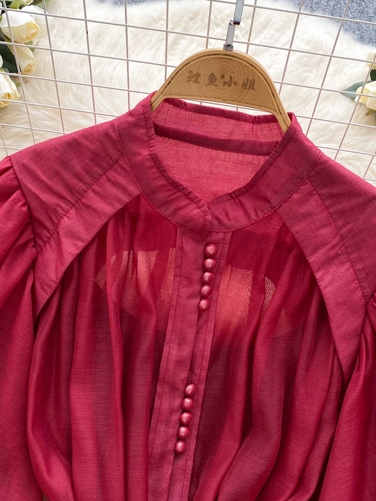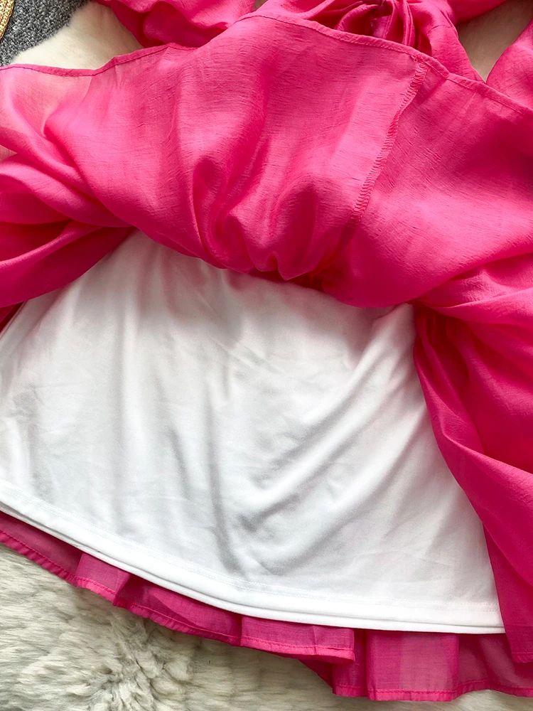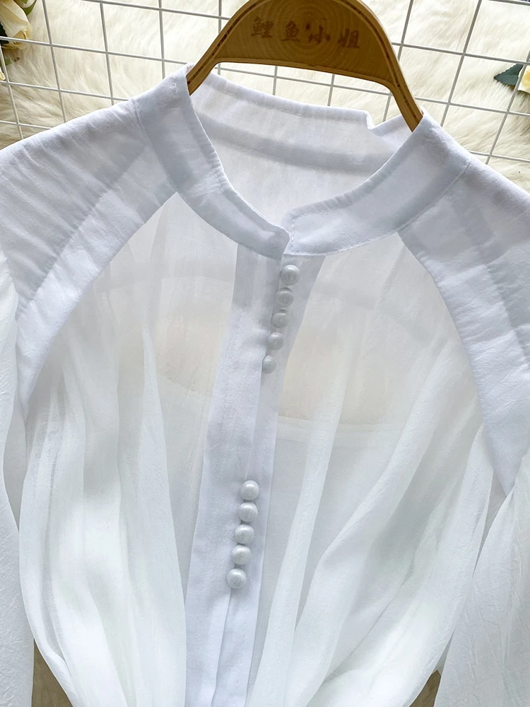 Summer Women's Puff Sleeve Shirt Dress Fashion Beach Vacation Party Birthday Blue White Exquisite Chiffon Mid Length Dress B06