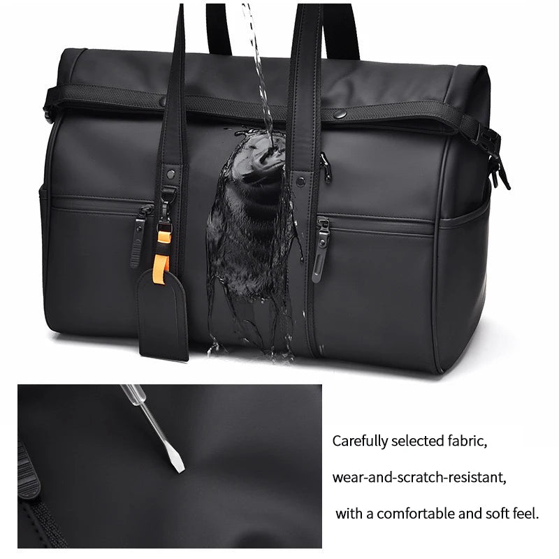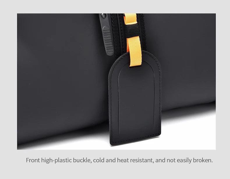 Details: Sturdy and comfortable handle with snap; front fixing buckle for the opening for better security; detachable shoulder strap; roll-top design for expandable capacity; decorative badge card; luggage trolley sleeve for easy travel