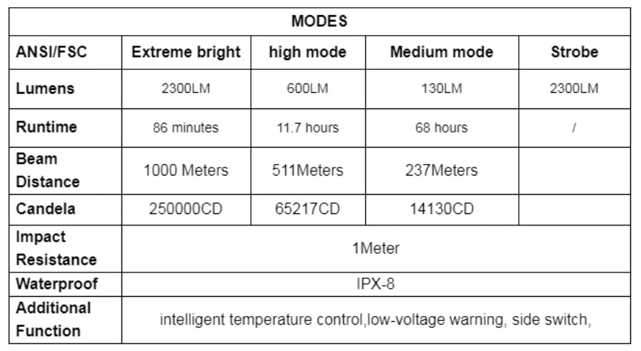 Testing done with 3500mah 18650 battery,All performance claims to ANSI/NEMA FL1-2009 Standard.