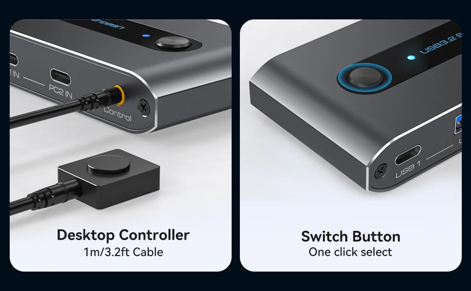 The USB-C switcher offers two switching modes-desktop switch and push button switch, allowing for seamless device switching. You can discreetly conceal the USB C switch to declutter the desktop and save space, and then utilize the desktop switch to switch between devices at your convenience.