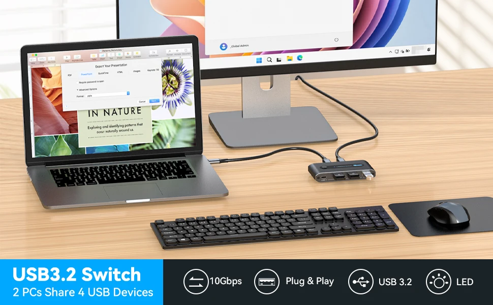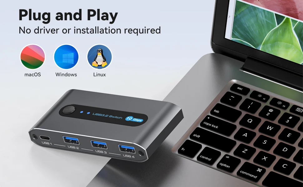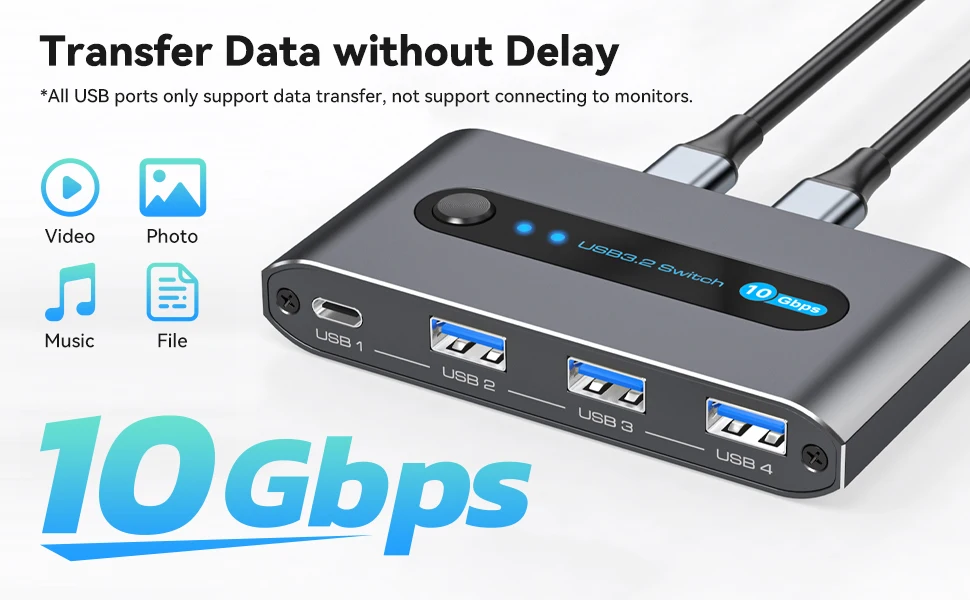 USB 3.2 Switch supports up to 10Gbps data transfer and is backward compatible with USB 2.0 and USB 3.0.