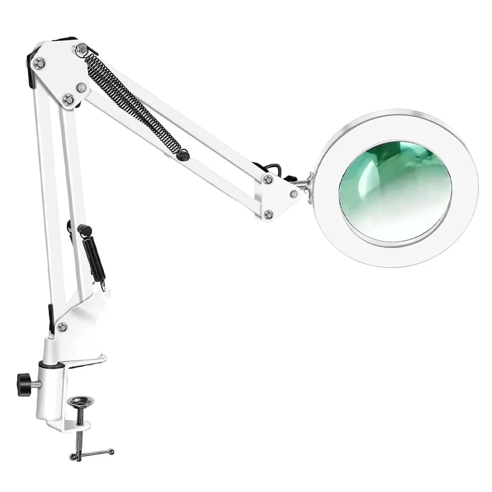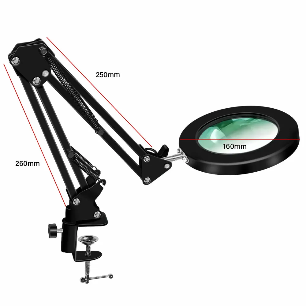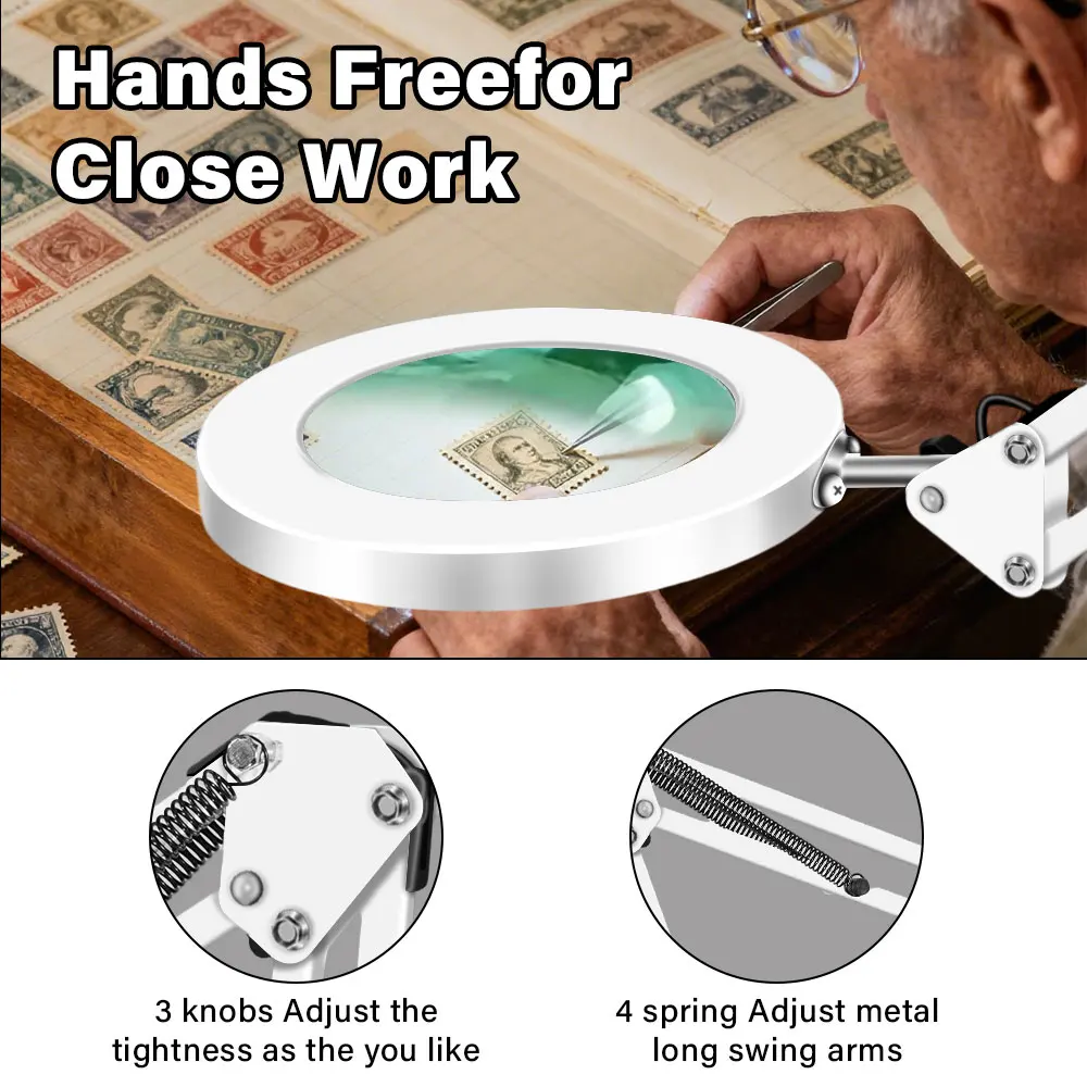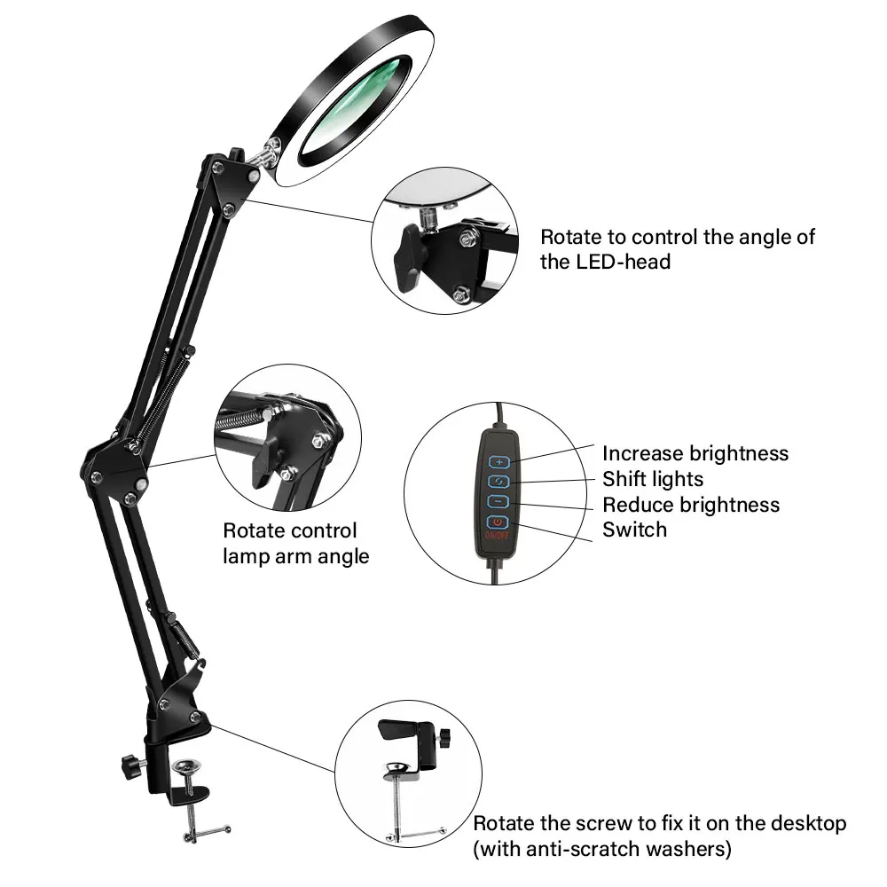 Freely rotating arm: The glass lens can be adjusted up and down by 270° and rotated 360°. The telescopic long arm provides you with greater flexibility. The arm can be extended to 270cm, with 3 knobs and 4 springs. By adjusting the knobs, the LED light can be kept at the desired position without moving easily, thus freeing up both hands. The metal clip can firmly fix the magnifying glass lamp to prevent it from tipping over. Suitable for desks, workbenches, shelves, tables, etc.