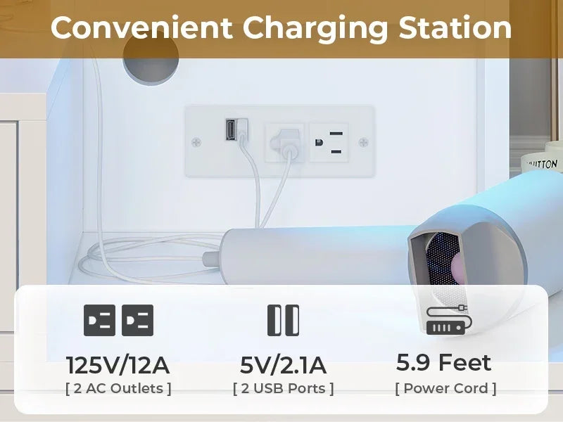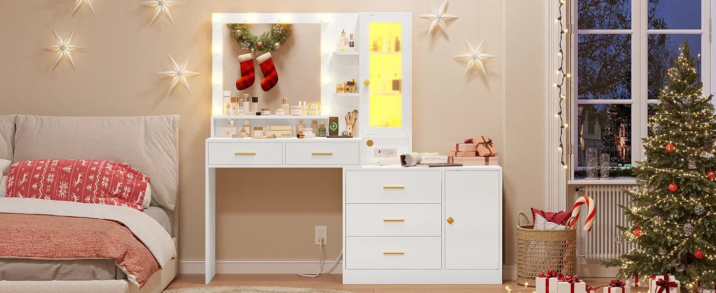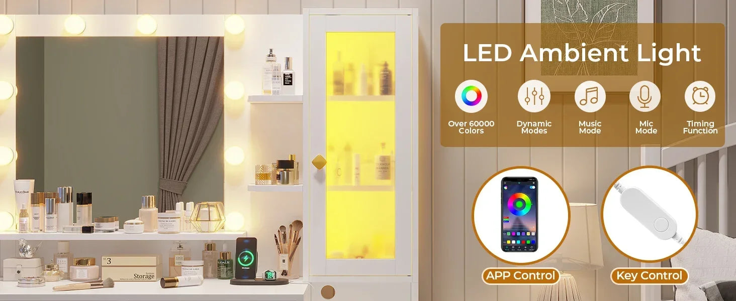 Vanity Desk, Makeup Vanity with Lights & Charging Station and Ambient Light, Vanity Table with Dresser, Bedroom Furniture