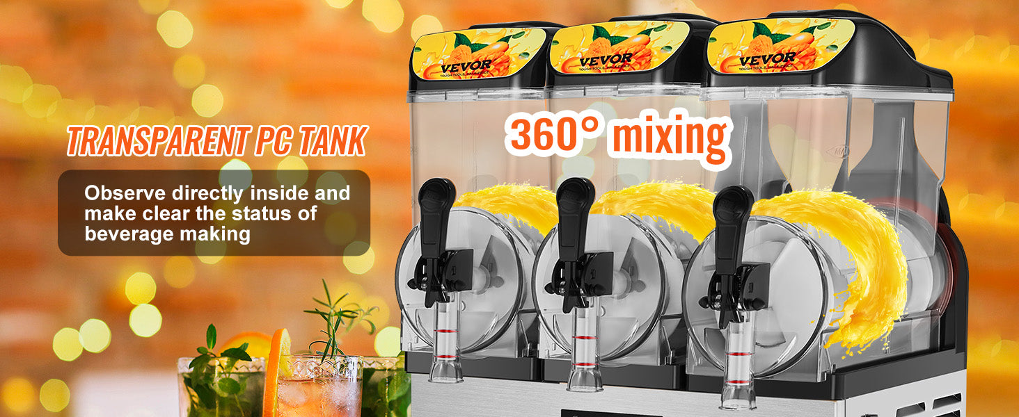 - 3 x 12L Slushie Machine: Double-bowl slushy machine, 12L (3.2 Gal) in capacity. Our commercial slushy machine can make 150 cups of slushy (250ml per cup) within one hour, catering for a large number of people at the same time. Moreover, slush or alcohol drinks can work separately and let you enjoy a refreshing drink anytime.