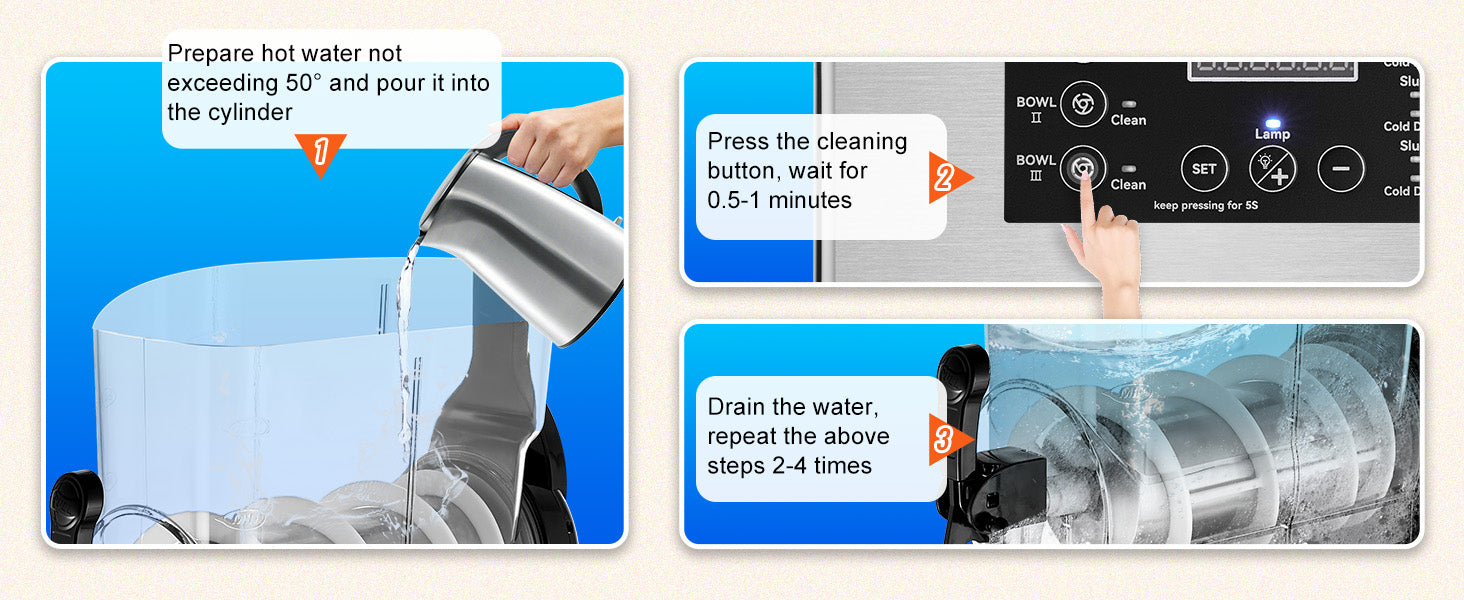 - Precise Control Panel: This slushie machine is equipped with an easy-to-operate panel. Each bowl can be operated independently, with a clear digital display at a glance. Adjusting the hardness according to your needs has never been easier. The simple one-touch operation allows to serve your favourite frozen drinks. There are also thoughtful settings for self cleaning.