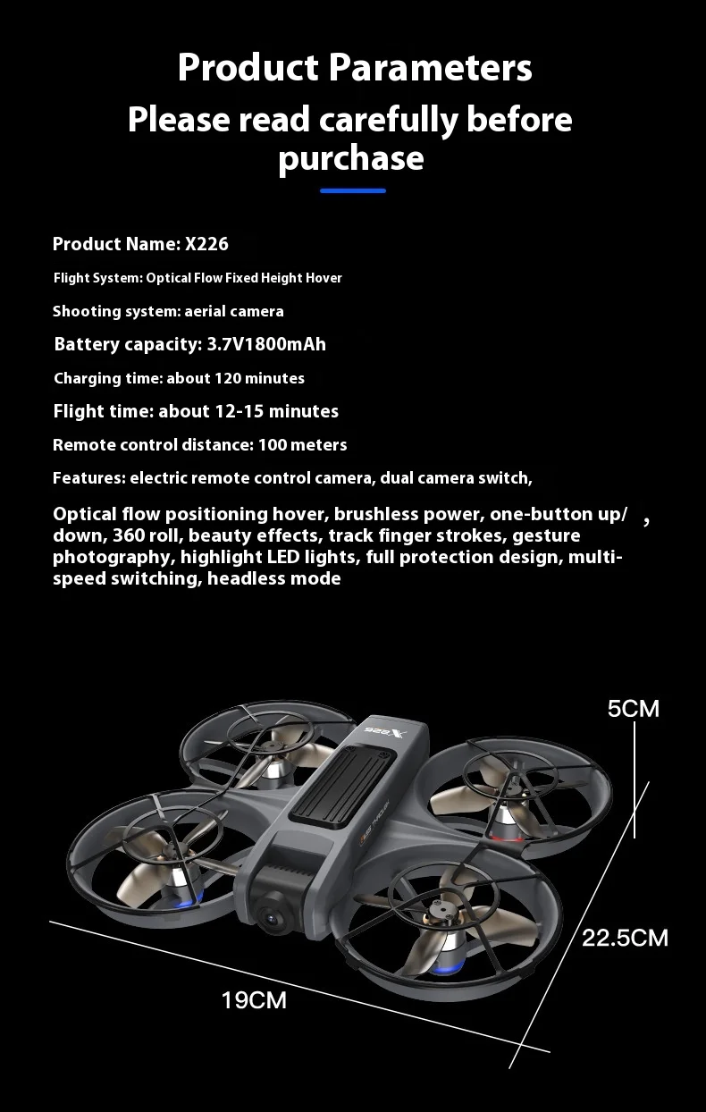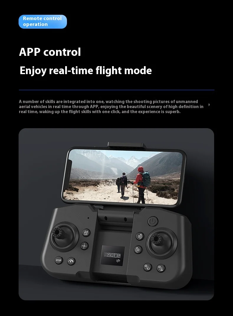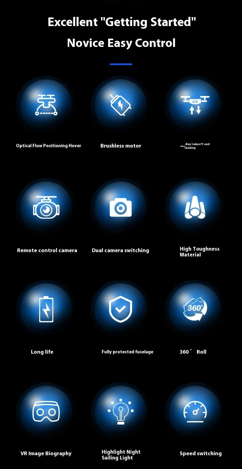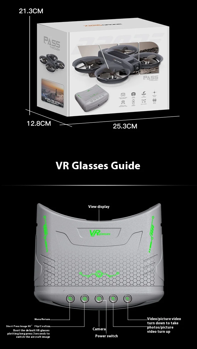Featured Features: VR glasses, brushless motor, intelligent obstacle avoidance, optical flow positioning, electrically adjustable lens, high-definition dual camera, one click takeoff and landing, headless mode, foldable