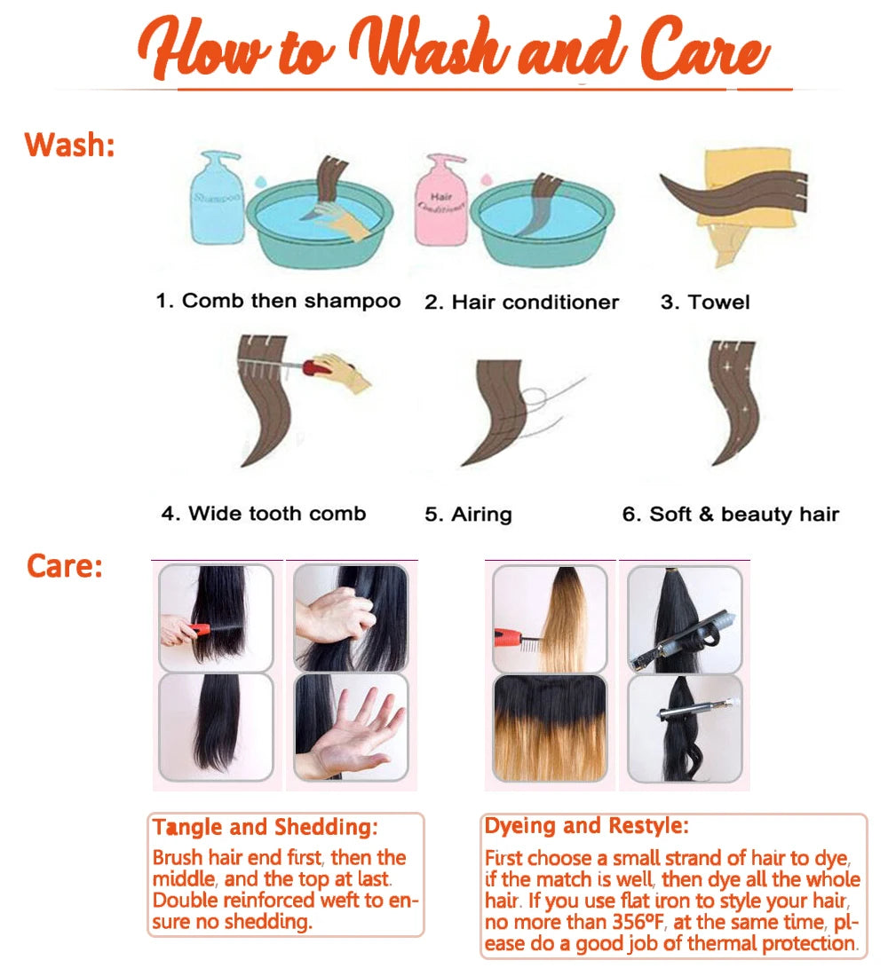 A8:When you care the hair, washing it twice a week is necessary. Detangle the hair before washing. After the wash, you can use the hair conditioner to make the hair soft and silky. Comb the body wave or straight hair with a wide brush, if your hair is curly hair, please comb it by the fingers! When you wet it and add coconut oil cream in the hair to keep the hair curl pattern!