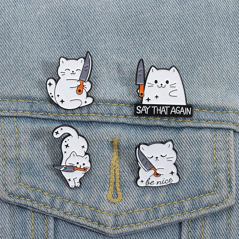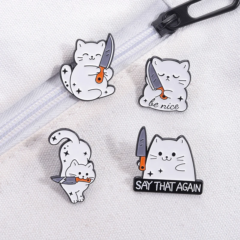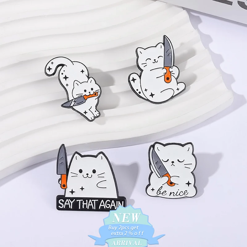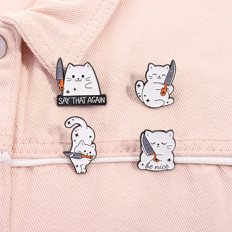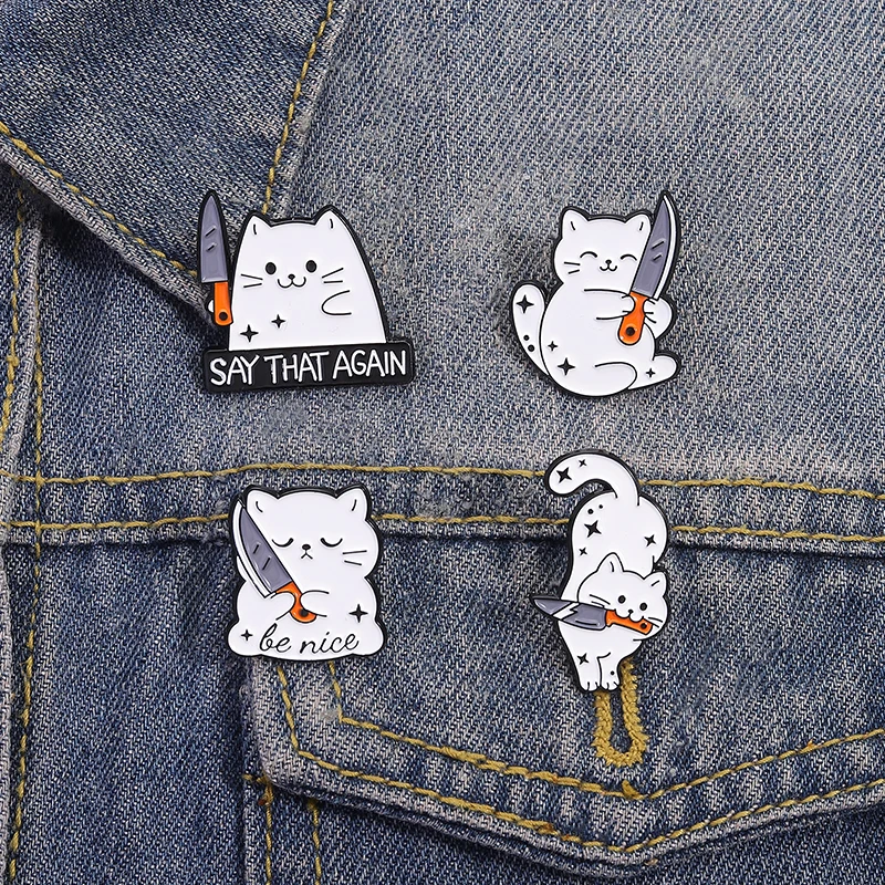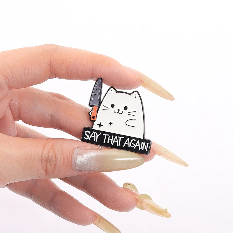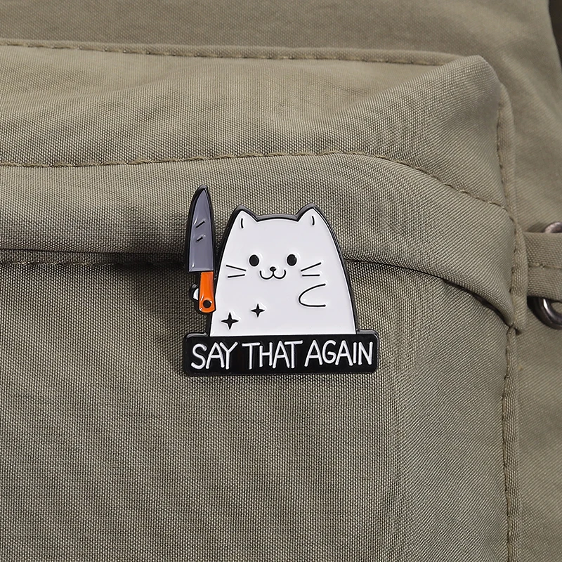 White Cat Holding Knife Enamel Pins Threatening Provoking Quotes Say That Again Brooch Bag Lapel Badge Jewelry Fans Gifts