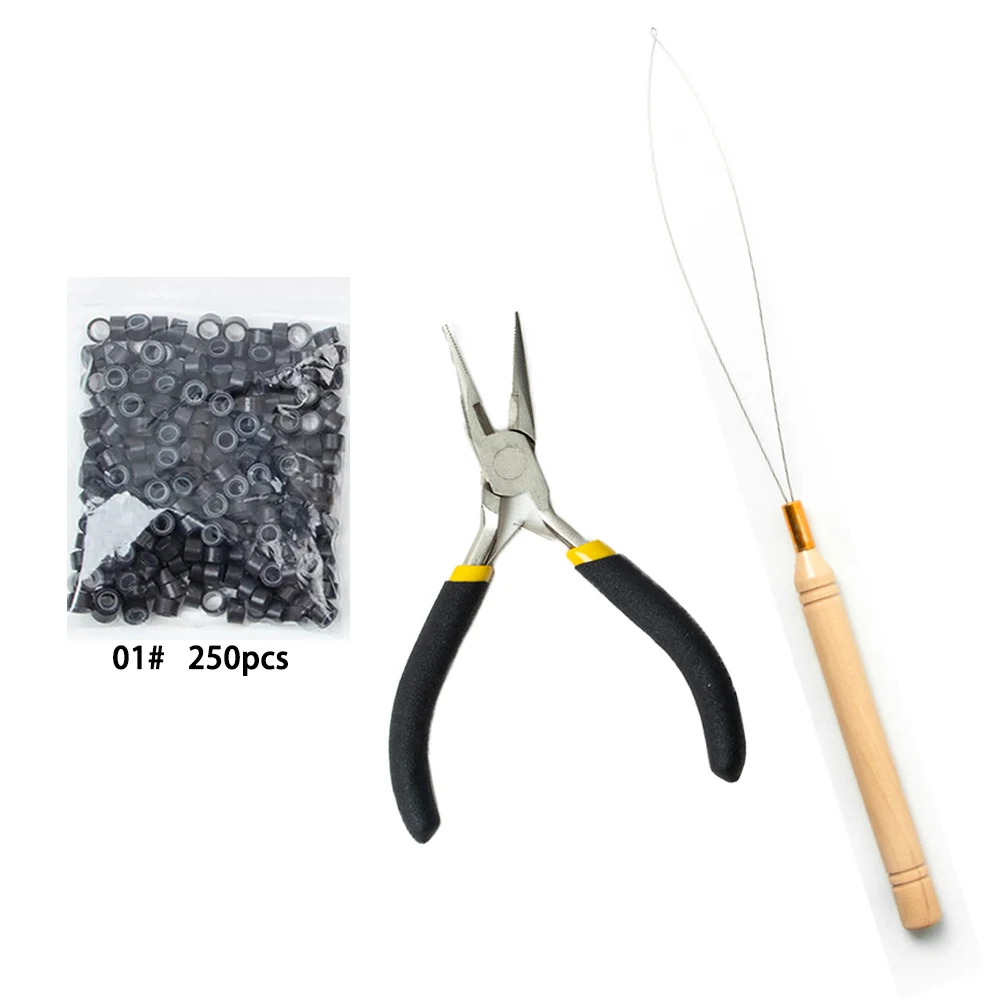 Wig installation kit includes hair extensions pliers, Beading tool and 250pcs silicone rings for hair extension accessories