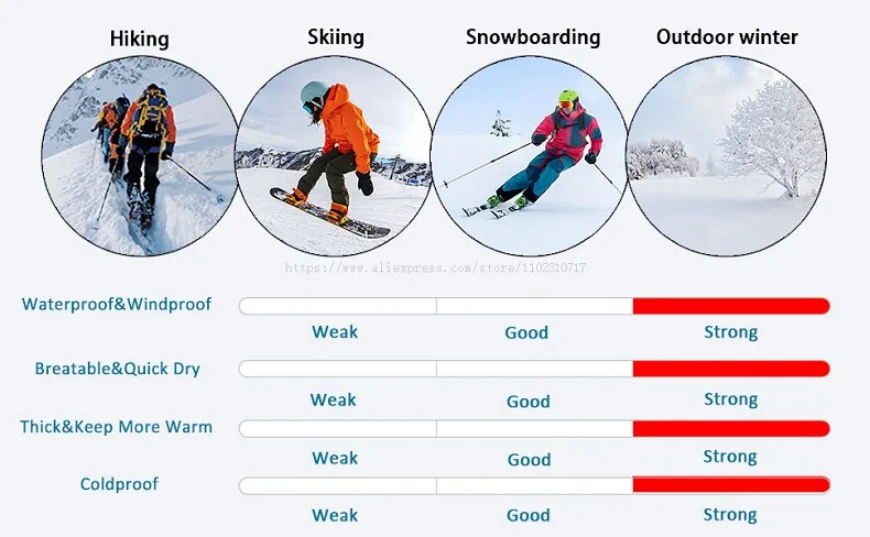 The function of the ski suit is water repellent, warmth, windproof, snowproof, breathable, and uses a caulking process