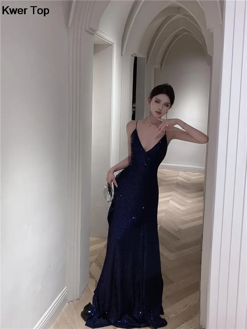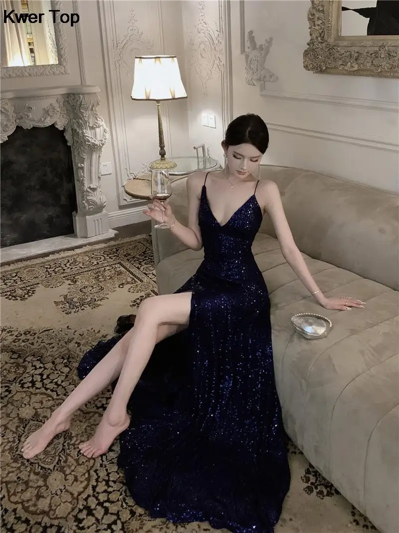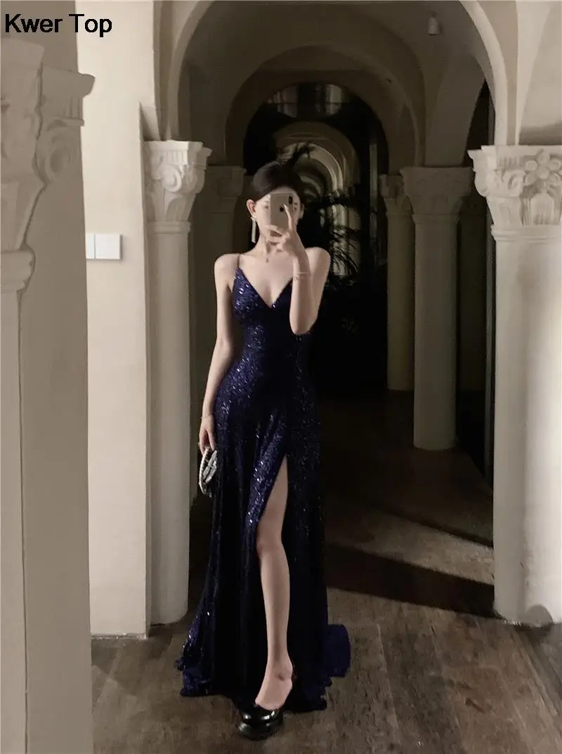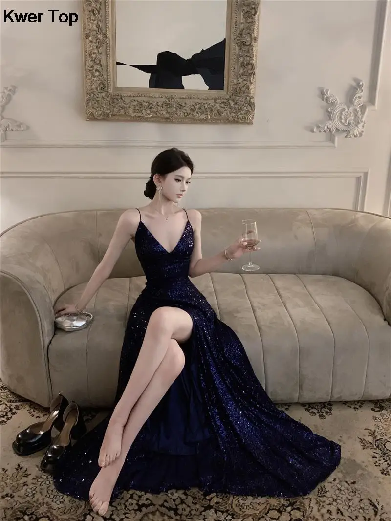 Women's Elegant V-neck Sequin Graduation Dresses Sexy Backless Split Bandage Runway Robe Summer Luxury Formal Occasion Clothes