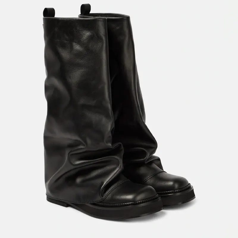 Women's New Autumn and Winter Calf Boots with Pleated Thick High Heels and Fashionable Oversized Street Leather Mid Leg Boots