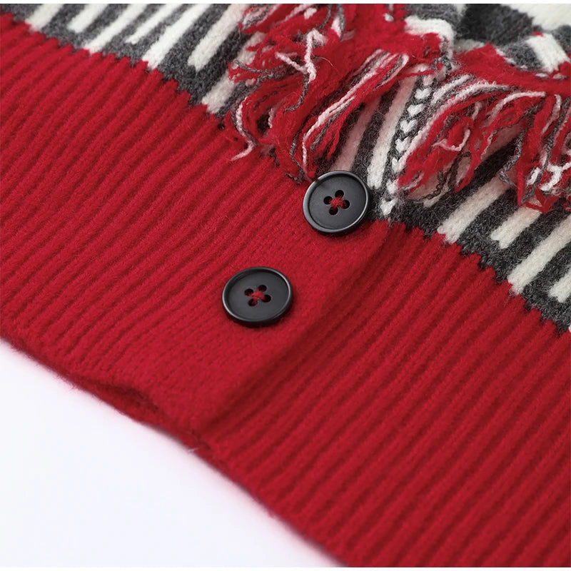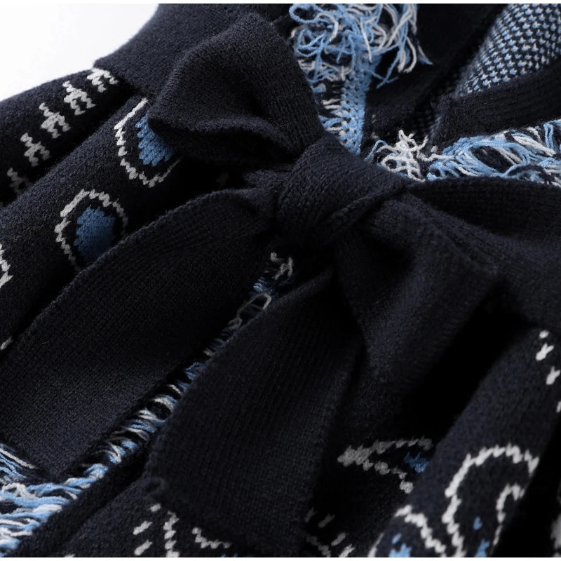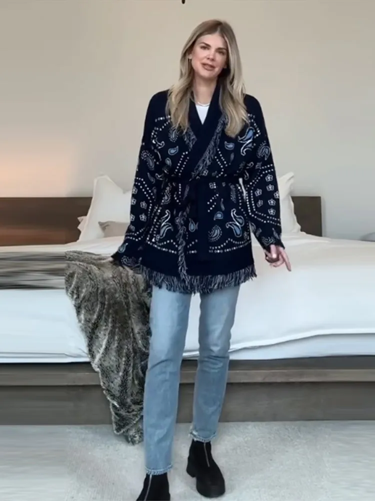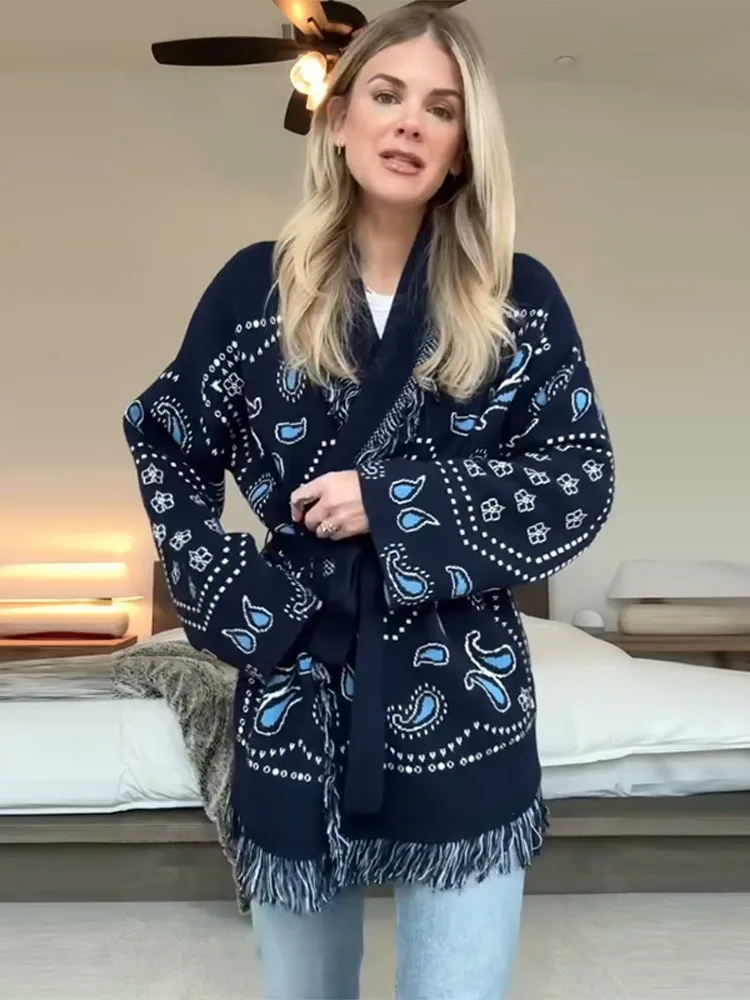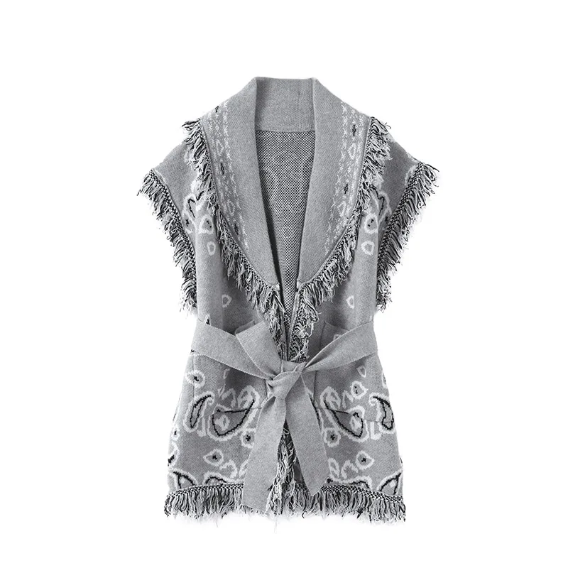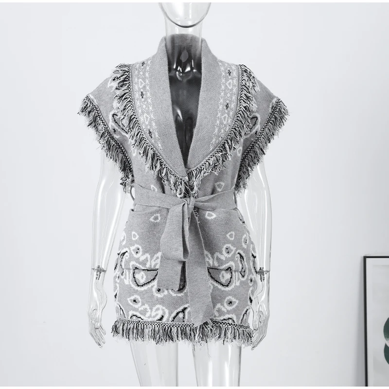 Women's Print Fringe Knitted Vest Coat Fashion Sleeveless Tie Waist Pocket Cardigan Sweater Lady 2025 Autumn Casual Outerwear