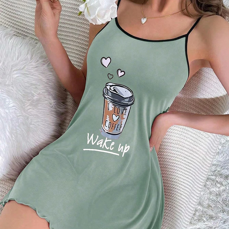 Women's Sleepwear Loungewear Casual Sexy Print Lettuce Trim Crew Neck Backless Sleep Dress Slip Nightdress Nightgown Sleepshirt