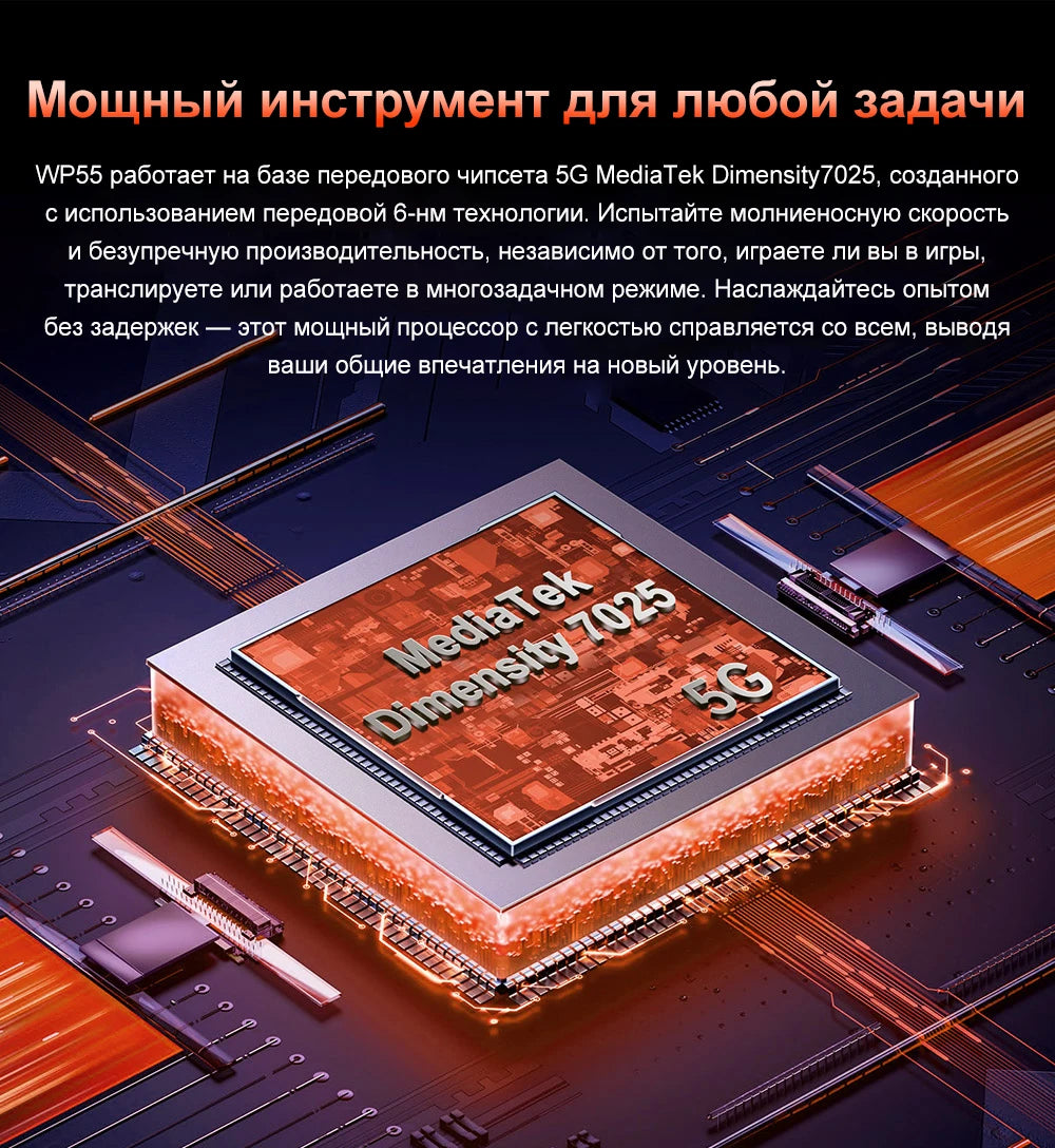 The WP55 is powered by the cuting-edge 5G MediaTek Dimensity 7025 chipset, crafted with advanced 6nm technology.Experience lightning-fast speeds and seamless performance whether you're gaming, streaming, or multitasking. Enjoy a lag-free experience this powerhouse handles everything with ease, elevating your overall experience to new heights.