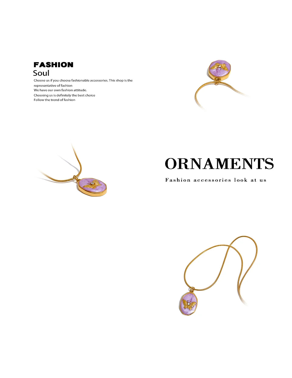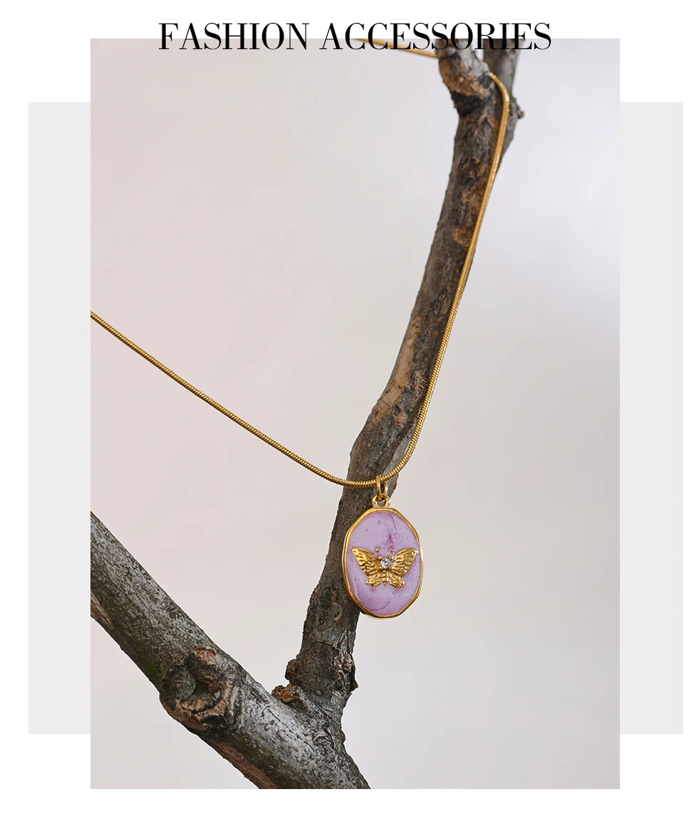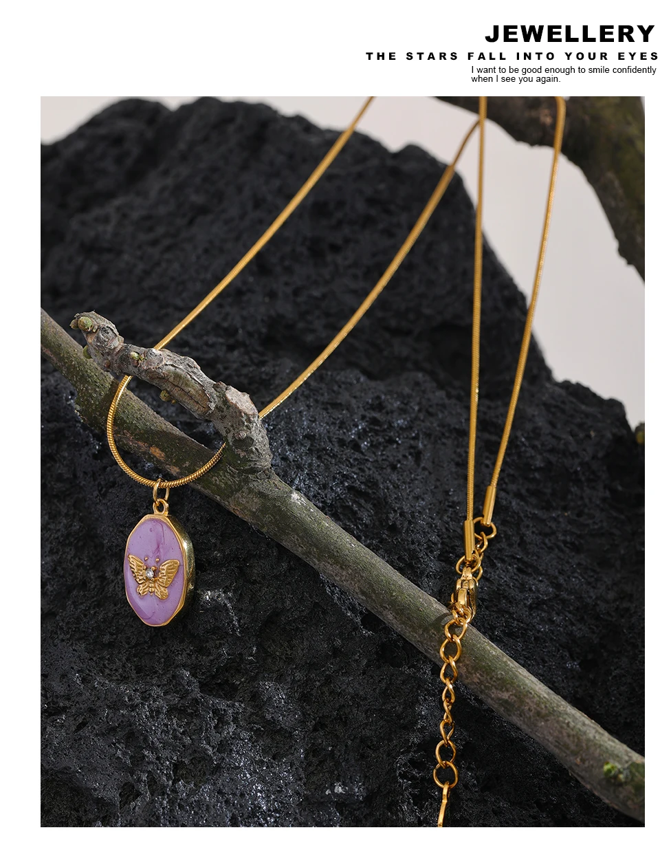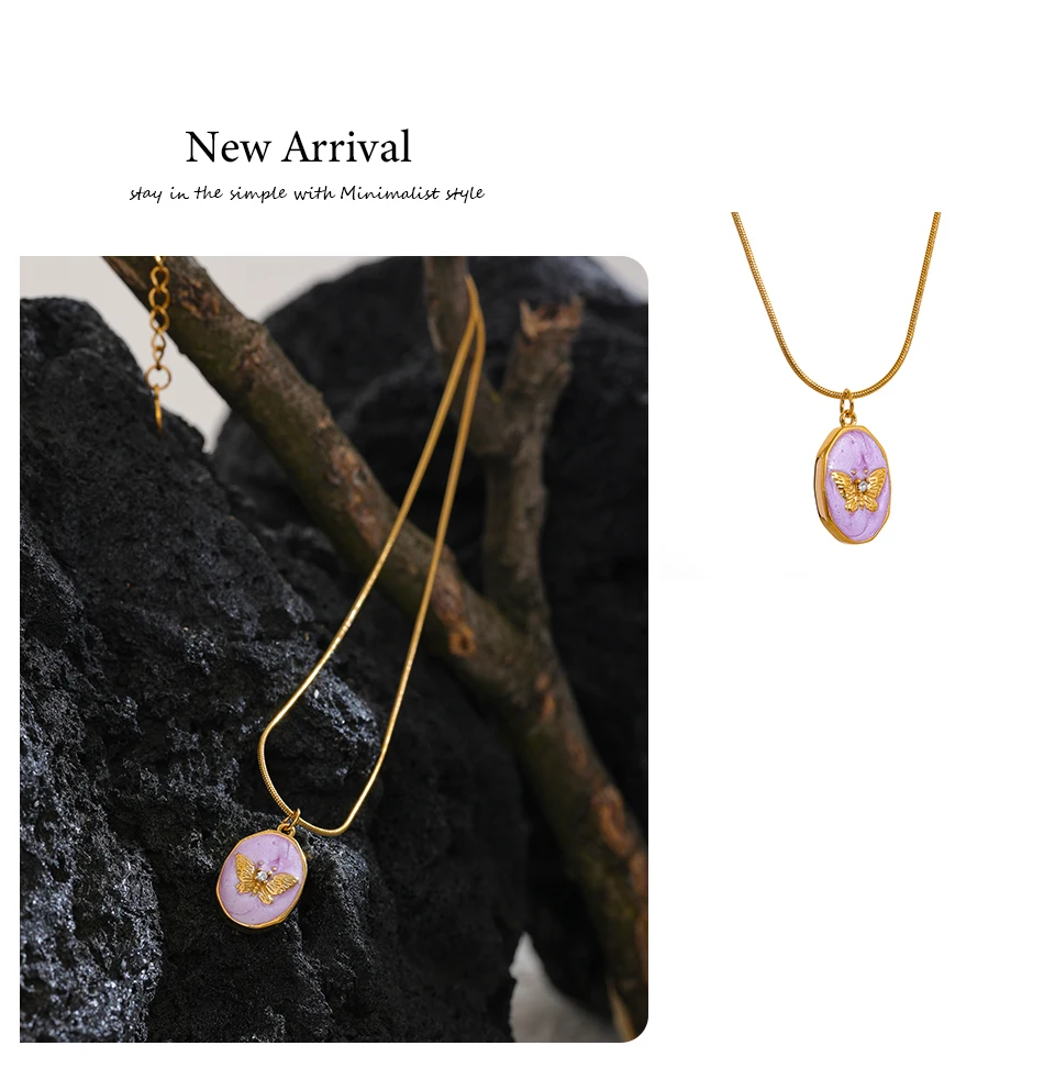 Yhpup Pink Enamel Butterfly Gilding Geometric Pendant Stainless Steel Collar Fashion Necklace for Women Korean Chic Jewelry Gift